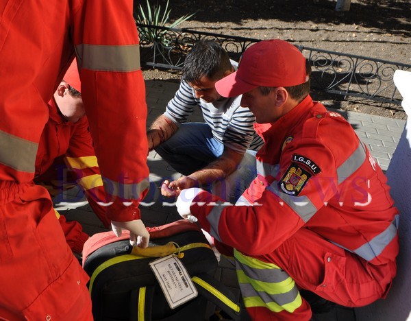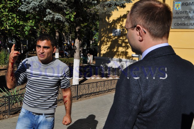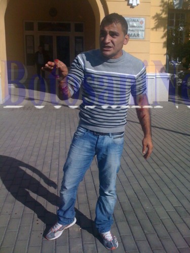 barbat automutilat protestUn bărbat de etnie romă, de 31 de ani, a recurs, joi, la un gest extrem. El s-a crestat pe braţe cu o lamă de ras, pentru o locuinţă. El a protestat preţ de câteva zeci de minute în faţa Primăriei şi a avertizat cadrele medicale, ajunse la faţa locului pentr a-i oferi îngrijiri medicale, că se sinucide în caz că se apropie de el. Nici jandarmii nu au putut interveni, pentru că la fiecare gest bărbatul îşi cresta cu lama braţul.