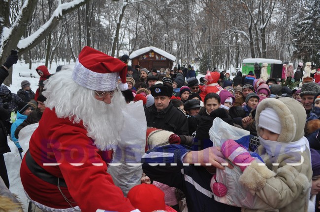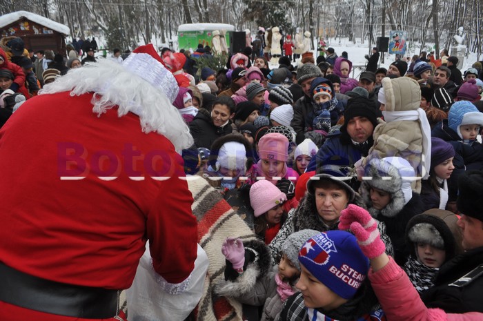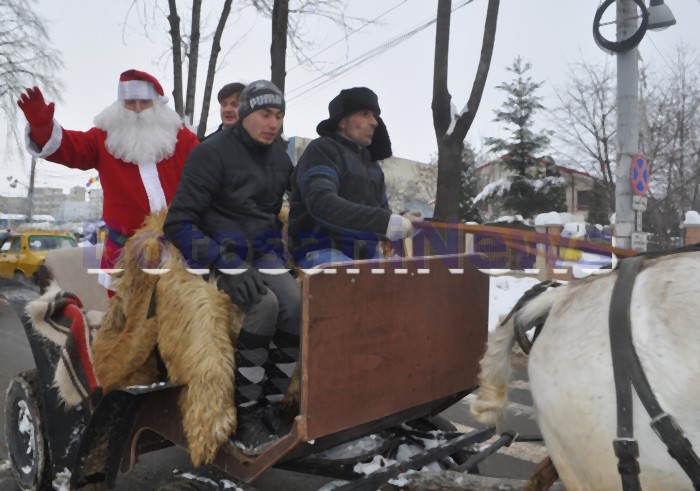 Moş Crăciun a împărţit, duminică, cadouri la aproape 2.000 de copii din municipiul Botoşani. Pentru că străzile nu mai aveau zăpadă, Moşul nu a mai putut folosi sania, astfel încât a ajuns la primărie, dar şi la patinoar şi în Parcul Mihai Eminescu cu o trăsură cu cai.