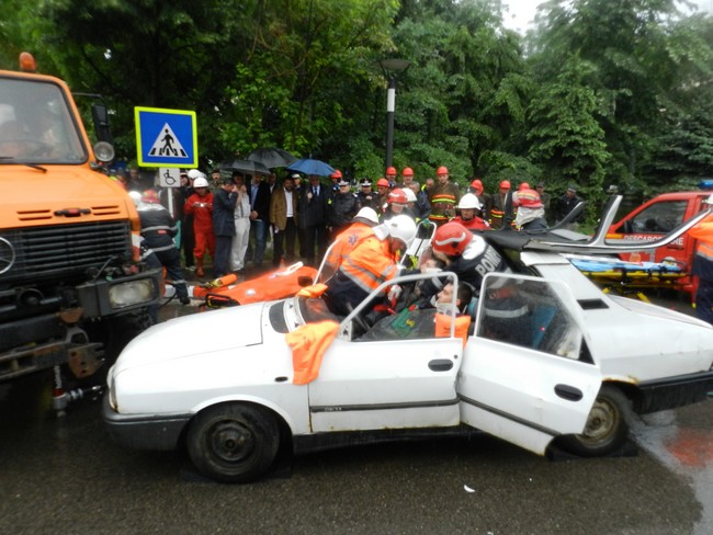 A urmat simularea unei intervenţii de salvare a două persoane, rămase încarcerate într-un autoturism implicat într-un accident rutier, produs pe strada Cuza Vodă din municipiul Botoşani şi asanarea teritoriului de muniţia rămasă neexplodată.
