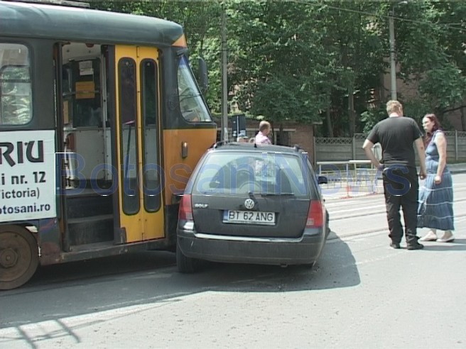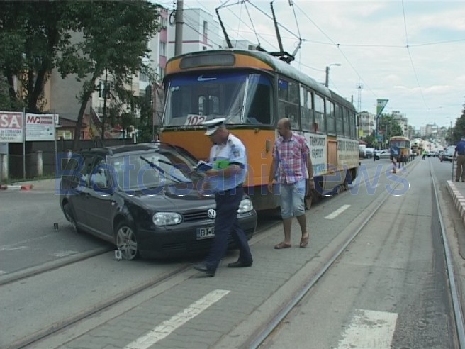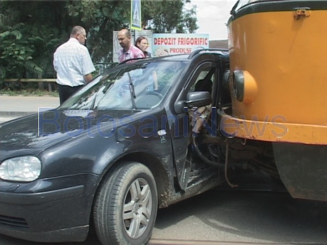 Un bărbat a fost rănit în urma unui spectaculos accident de circulaţie produs, sâmbătă la amiază, în faţa Liceului Textil din municipiul Botoşani. Costel Ioniţă, de 53 de ani, a nu s-a asigurat la un viraj, a intrat pe linia de tramvai, iar VW Golf al acestuia a fost lovit de tamvaiul care rula în spatele său, dinspre Gară spre Zona Industrială.
