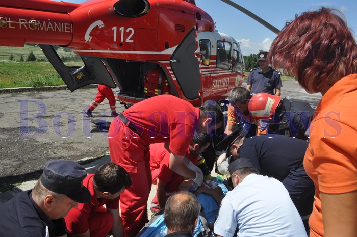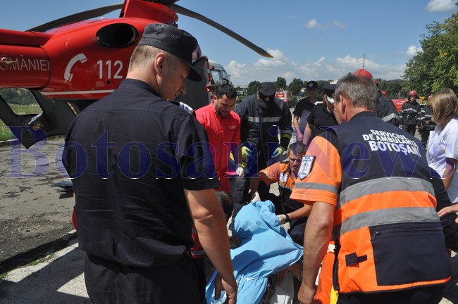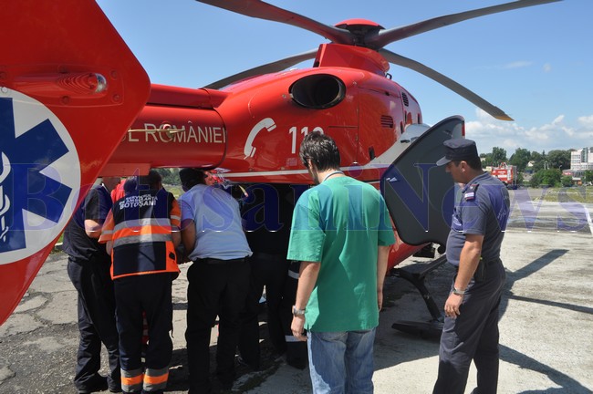 Un elicopter SMURD a fost solicitat, joi, pentru transportul patronului firmei Doma SRL, din Cătămărăşti, care a suferit traumatisme multiple în urma unei căderi de la înălţime. Aparatul de zbor a aterizat în Poligonul ACR din municipiul Botoşani şi a transportat victima la Clinica de Neurochirurgie din Iaşi.