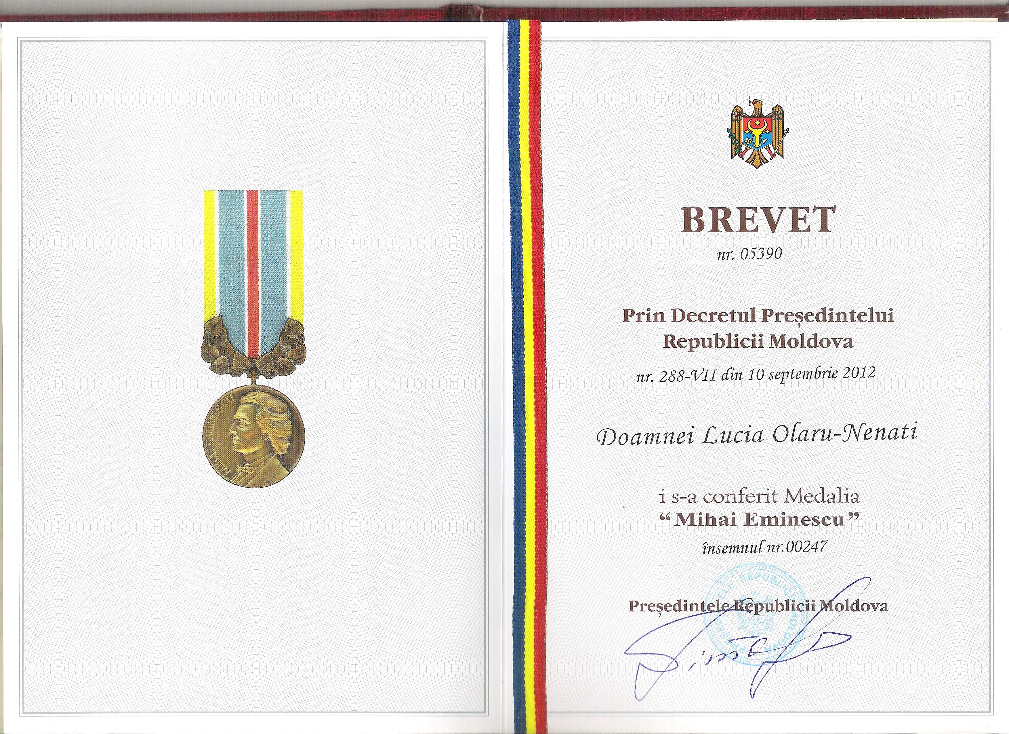 „Stimată doamnă prof. dr. Lucia Olaru Nenati vi se va conferi Medalia „Mihai Eminescu” în semn de înaltă apreciere a meritelor deosebite în activitatea de cercetare a moştenirii literare a scriitorului Mihai Eminescu şi pentru contribuţia esenţială la promovarea operei eminesciene şi la dezvoltarea relaţiilor interculturale”.