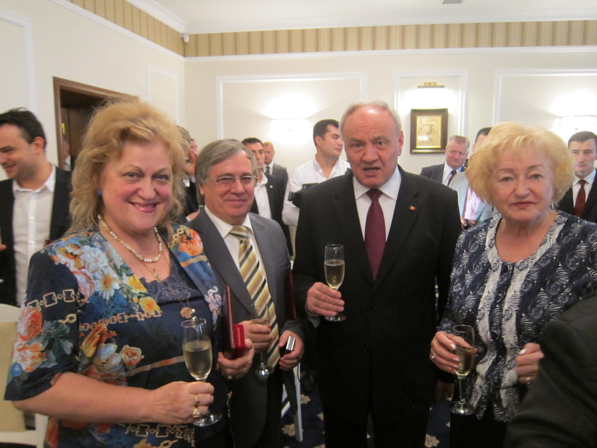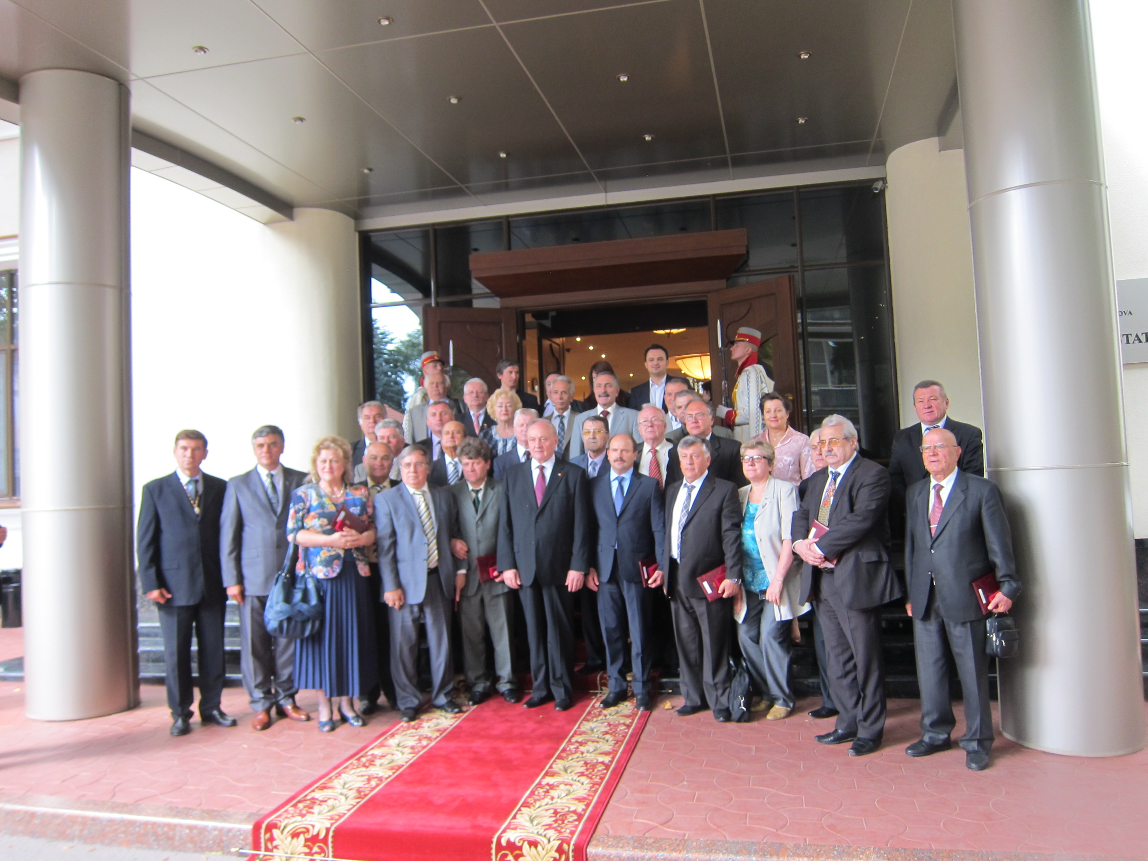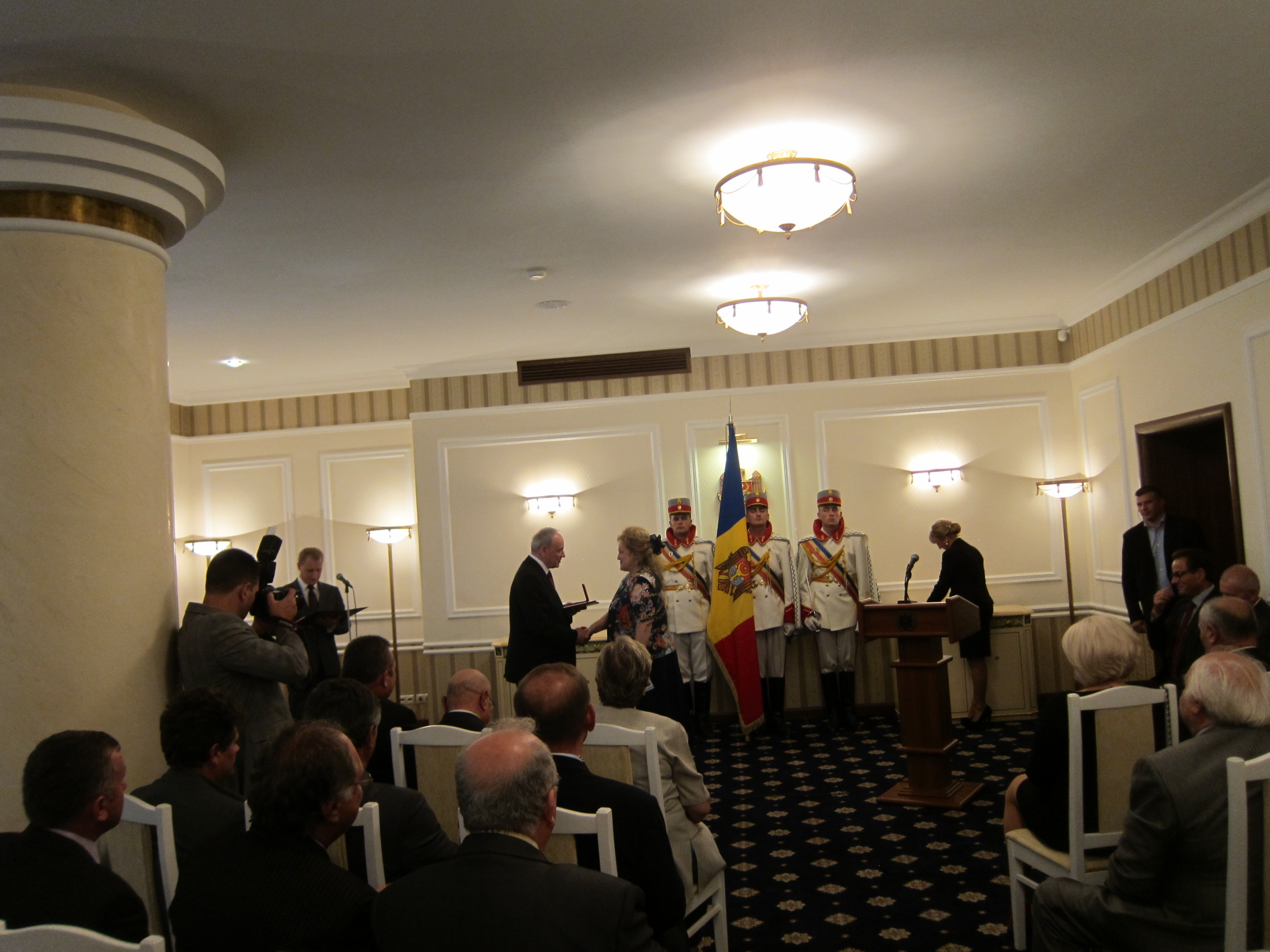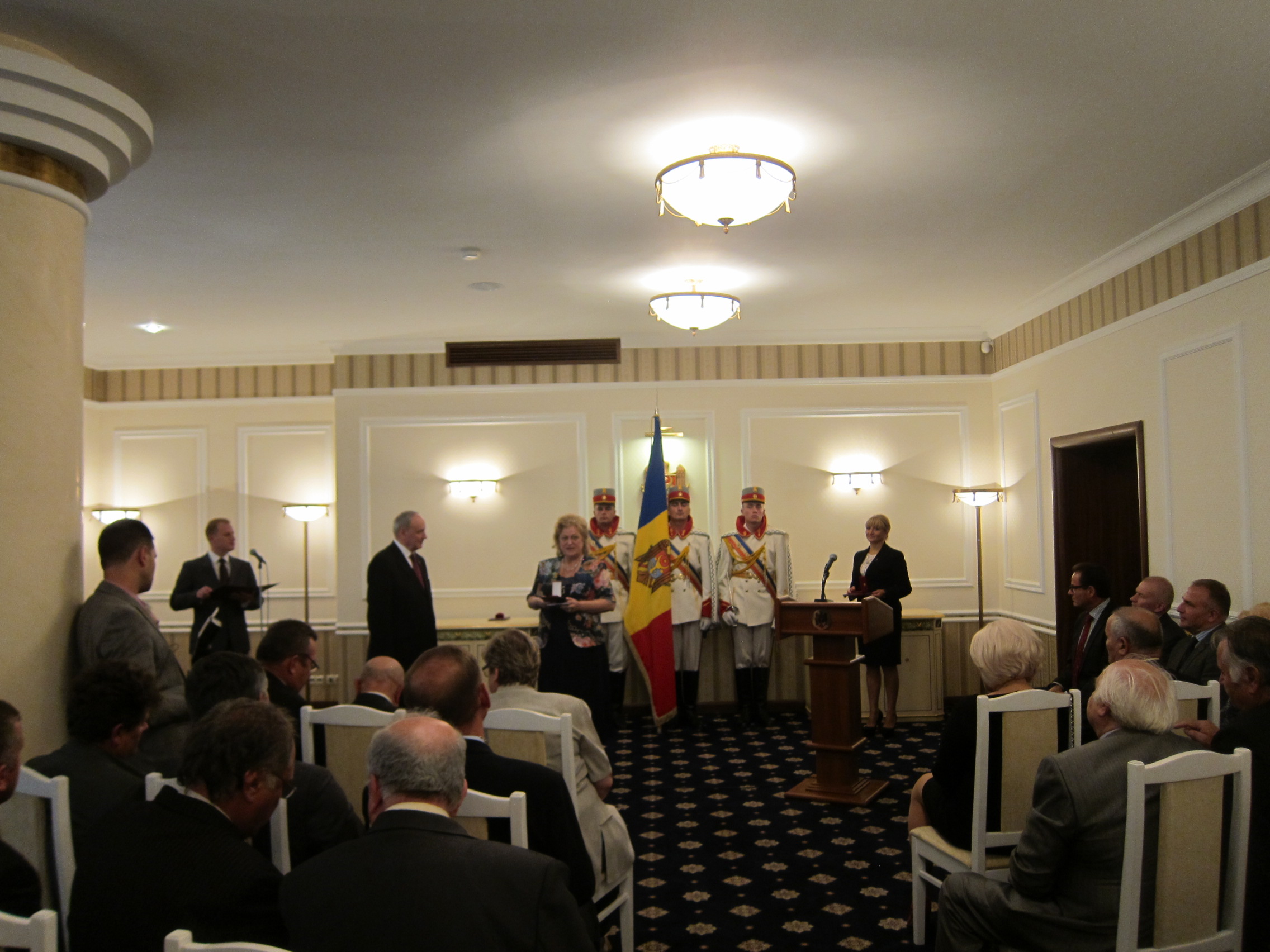 Grupul celor invitaţi a fost primit la palatul oficial unde, în prezenţa Gărzii de onoare a Republicii Moldova, în acordurile imnului de stat, preşedintele republicii, Nicolae Timofti, a înmânat fiecăruia dintre cei desemnaţi diferitele medalii adecvate personalităţii, activităţii şi meritelor fiecăruia, însoţite de brevetele prezidenţiale.