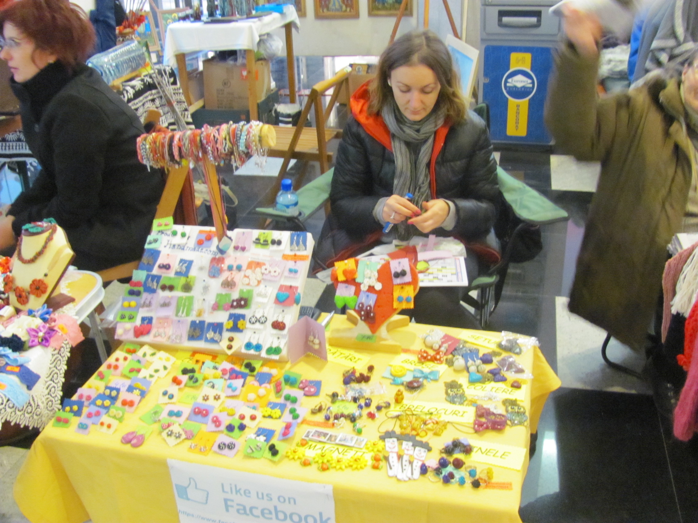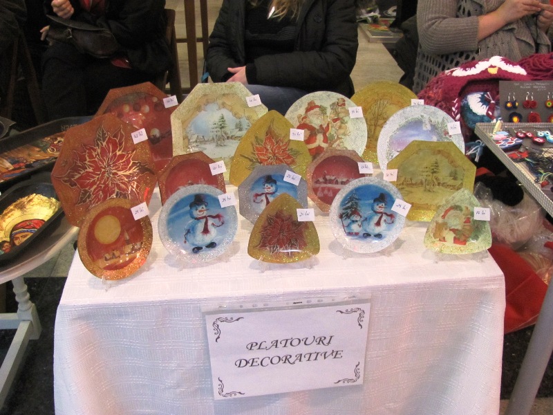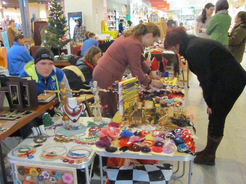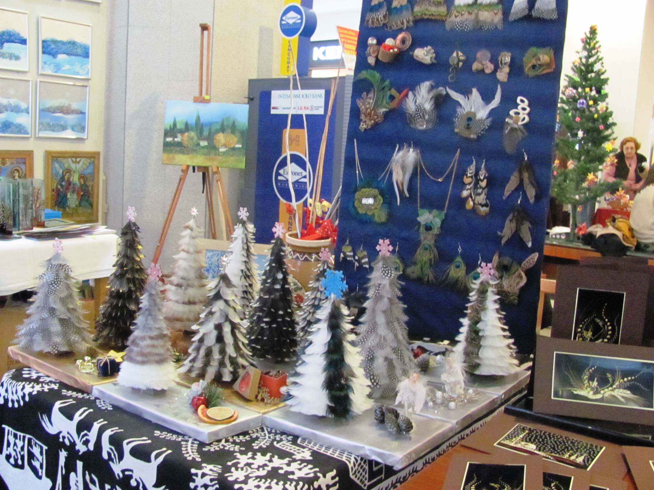 Podoabe de Crăciun, accesorii pentru vestimentaţie, bijuterii, decoraţiuni, miniaturi din lemn, împletituri din sfoară, tricotaje, picturi, papioane, păpuşi – toate acestea pot fi admirate şi cumpărate de la parterul complexului comercial unde se desfăşoară această primă ediţie a târgului.