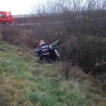 În urma impactului, mașina aflată în față a fost proiectată într-un șanț, răsturnându-se.