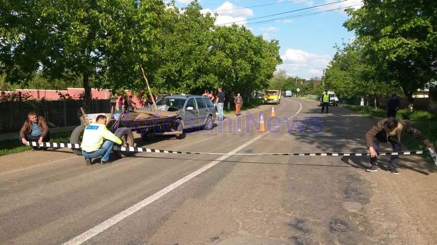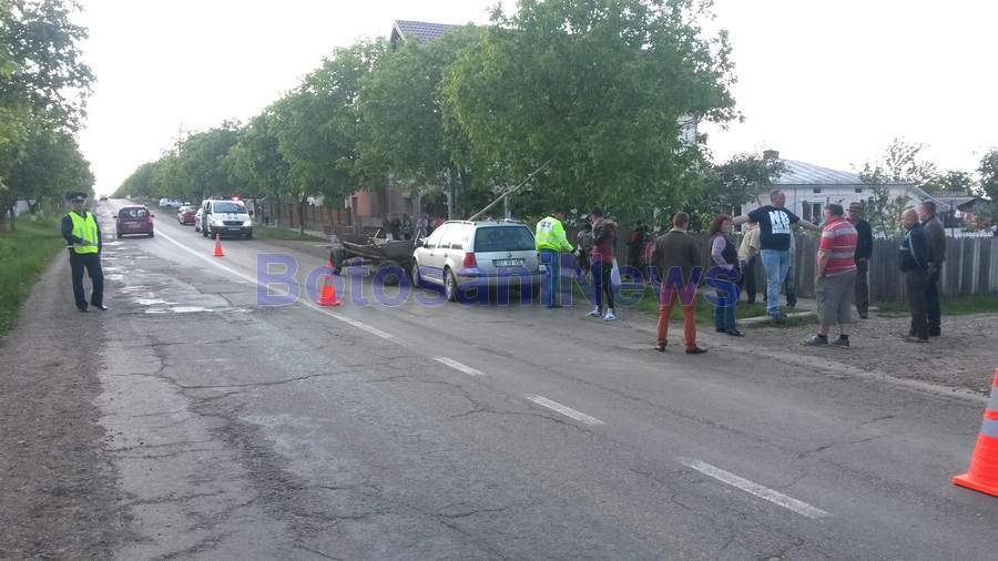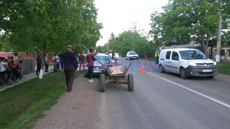 Șoferul acesteia, Costică V., nu a mai putut să evite impactul. În coliziune, calul a fugit, iar căruțașul a căzut în cap. El a fost transportat de urgență la Unitatea de Primiri Urgențe a Spitalului Județean Botoșani, cu o ambulanță de tip SMURD de terapie intensivă mobilă.