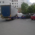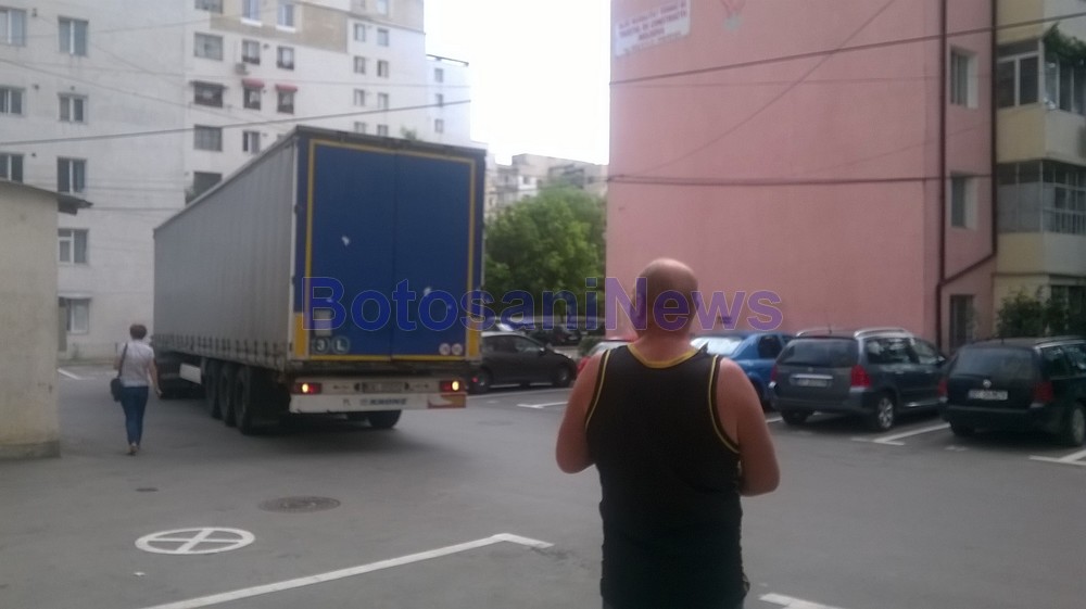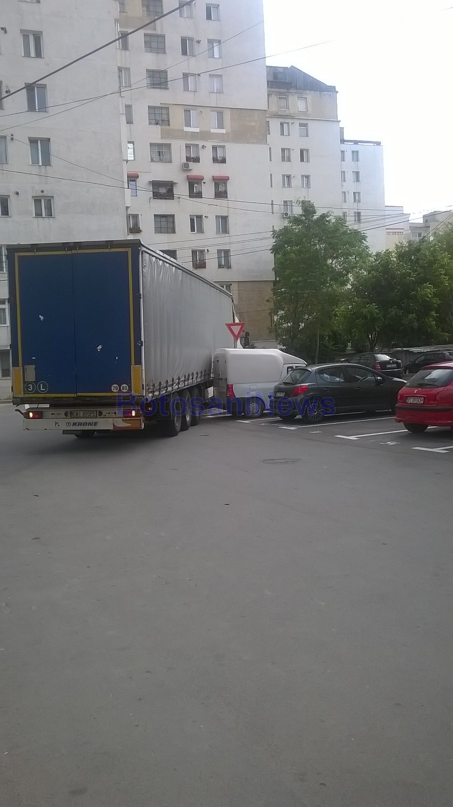 Dacă înainta, ar fi lovit o mașină parcată, dar conducătorul și-a dat seama, a coborât din tir, a încercat să împingă ușor mașina parcată mai în față, apoi a manevrat autotrenul cu spatele, cu ajutorul unor botoșăneni care s-au oferit să-l ghideze.