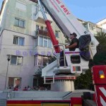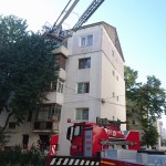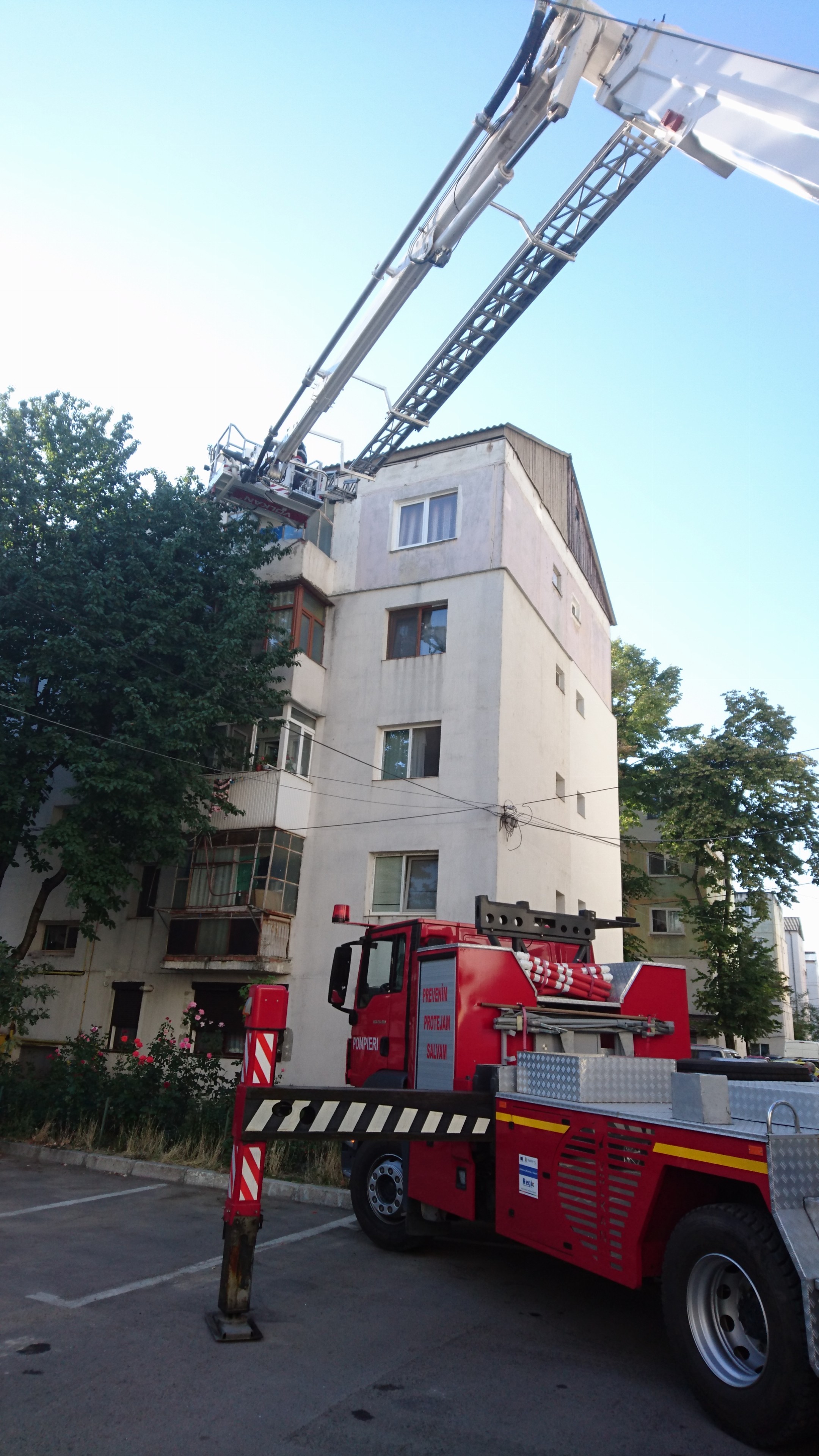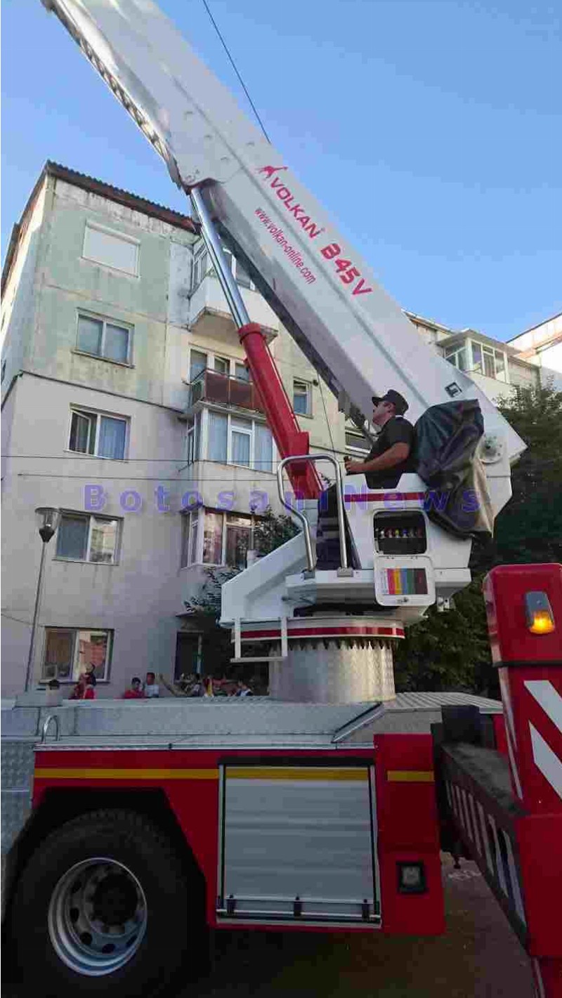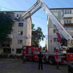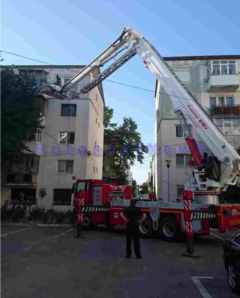 Pentru a nu sparge ușa imobilului, pompierii militari au pătruns în interiorul apartamentului cu ajutorul autospecialei multifuncționale pentru lucru la înălțime, care a fost ridicată până în dreptul balconului.