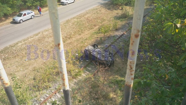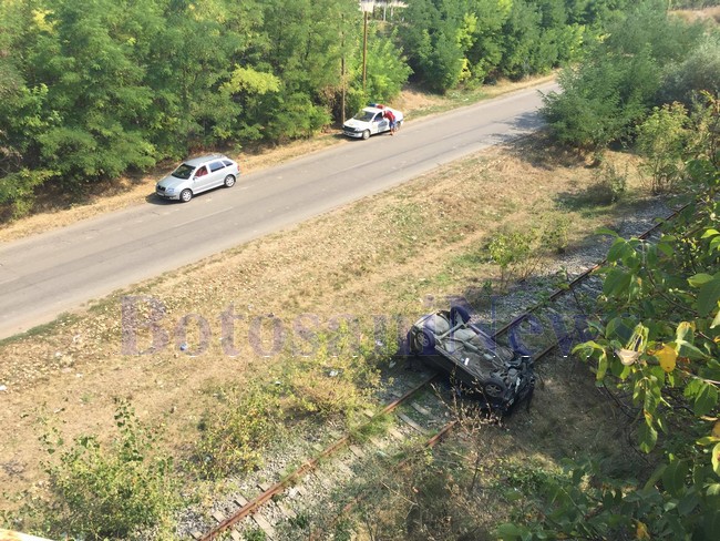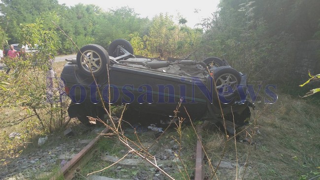 Maşina s-a răsturnat şi a ajuns pe cupolă pe şinele de tren.