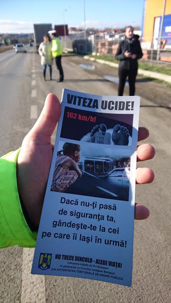 „Informăm şoferii cu privire la necesitatea respectării principalelor reguli de circulaţie. Le-am împărţit pliante şi i-am informat asupra priocnipalelor cauze care stau la baza accidentelor rutiere din judeţul Botoşani, care sunt viteza şi neacordarea de prioritate la pietoni”, a declarat ofiţerul Ionuţ Apostol de la Poliţia Rutieră.