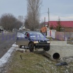 În urma impactului dintre maşini, autoturismul Skoda a ajuns într-un cap de pod şi a rămas suspendată, după ce a dislocat o bucată de beton.