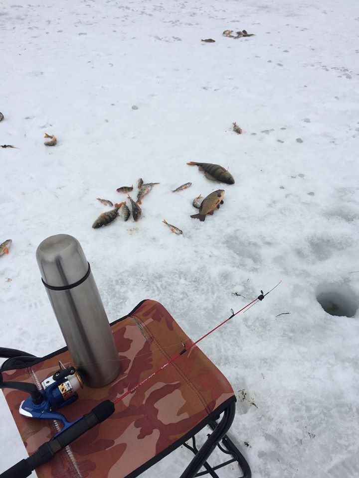 El a dat gaură în gheața groasă de câțiva zeci de centimetri și a avut noroc să prindă, pe lângă mai mulți pești mici, o știucă suficient de mare pentru a se fotografia cu ea.