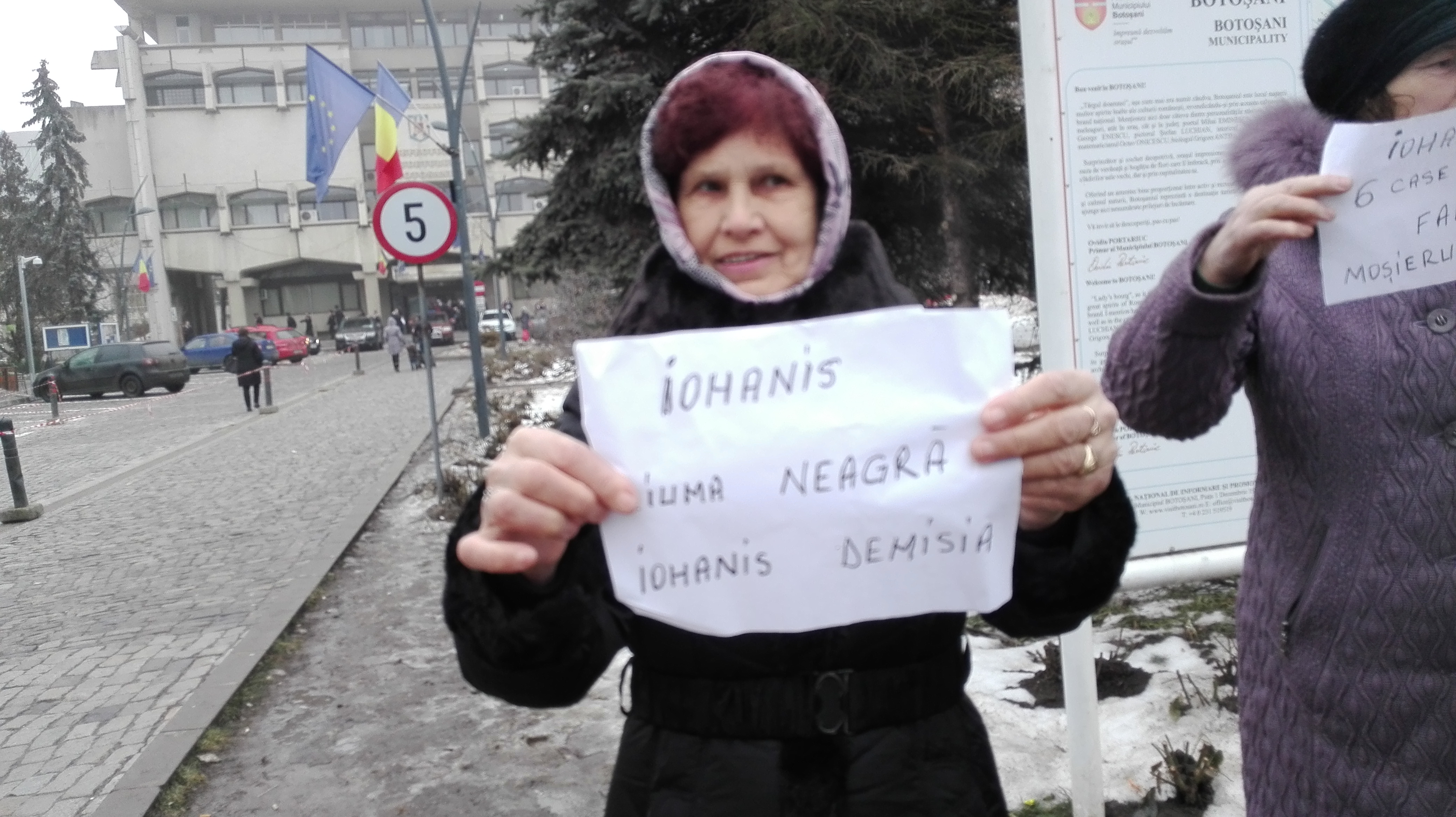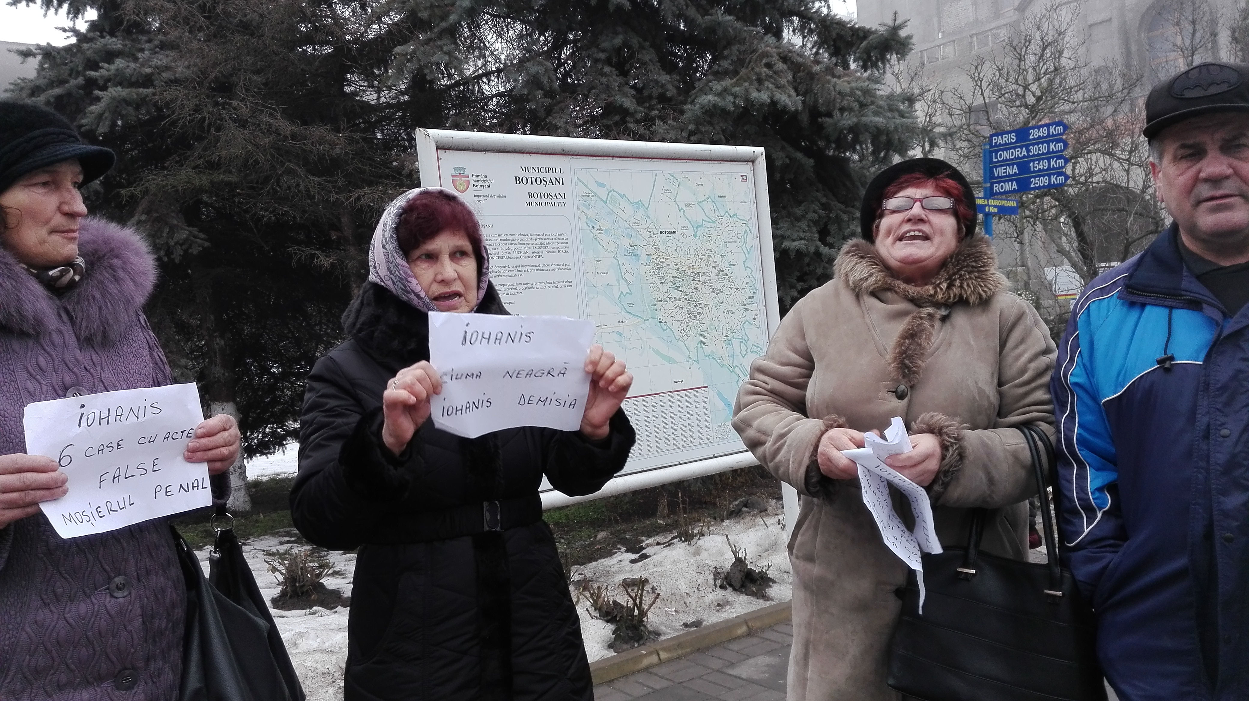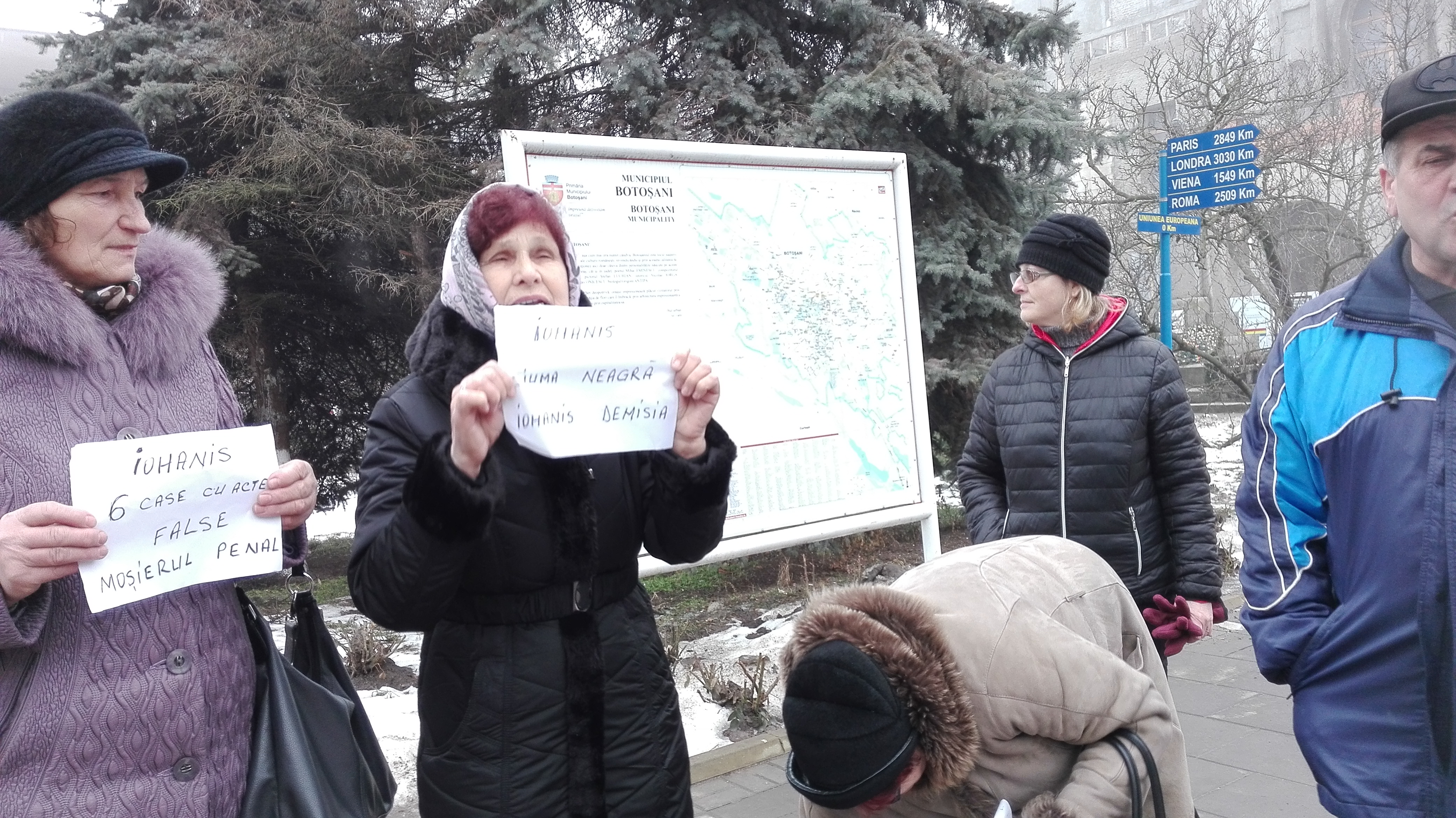 Mai multe persoane vârstinice au ieşit, luni după amiază în stradă, să protesteze împotriva preşedintelui. 7 persoane s-au adunat în faţa Teatrului Mihai Eminescu şi deşi nu au autorizaţie de protest spun că au ieşit în stradă să susţină actualul guvern ales democratic prin vot.