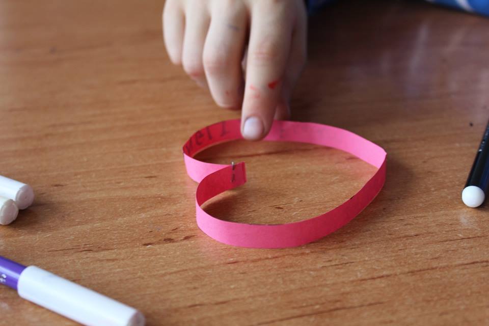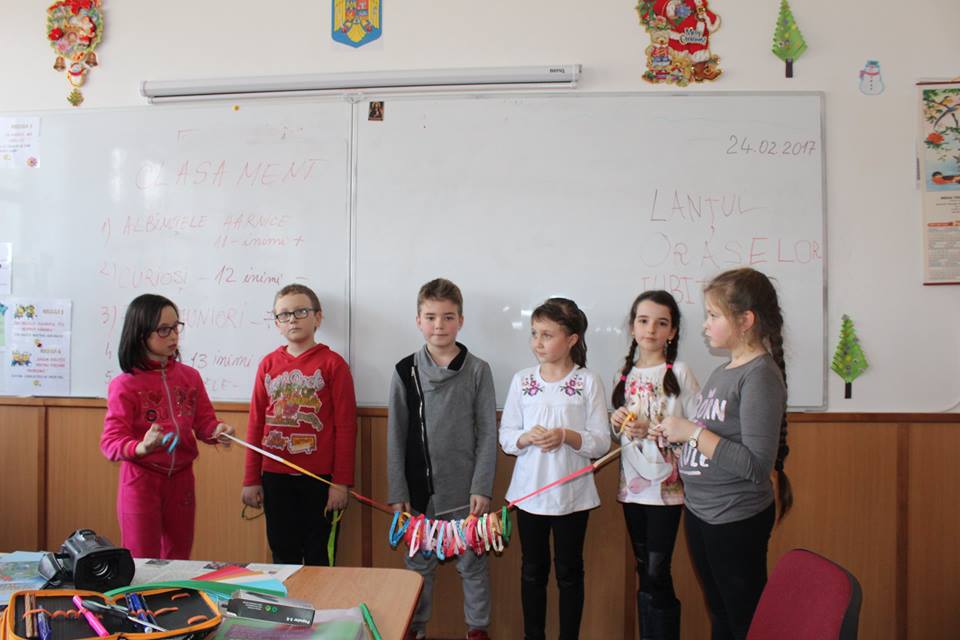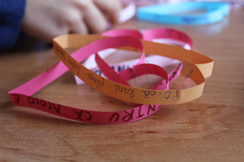 dragi. Toate inimile au fost apoi adunate într-un lanț cu care copiii și-au ornat clasa. Paris pentru că vreau să merg la Disneyland, Londra și Bigben, Madrid pentru că e în Spania de unde este și Messi, Paris, orașul luminilor, Roma și banuții de la Fontana del Trevi au fost doar o parte din mesajele pe care copiii le-au scris ordonat și colorat pe inimile realizate de ei.