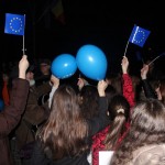 Reprezentantii Centrului Europe Direct Botosani au impartit baloane albastre copiilor prezenti iar copiii le-au luminat cu ajutorul lanternelor de la telefoanele mobile creand astfel o atmosfera feerica.