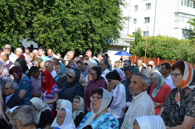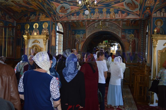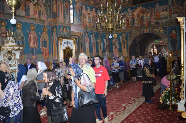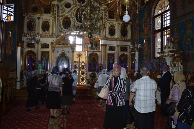Sute de persoane au asistat la slujba susţinută de ÎPS şi un sobor de 15 preoţi pe o scenă amenajată în curtea bisericii. Apoi oamenii s-au aşezat la rând şi au trecut prin Biserică.