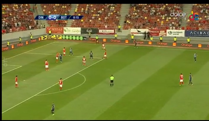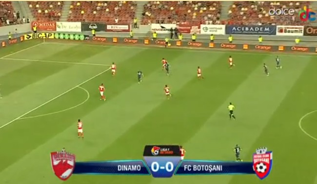 min.14 ocazie mare pentru Dinamo. Hanca nu reuşeşte să îl învingă pe Cobrea, după ce pătrunde în interiorul careului. Portarul botoşănean a avut o intervenţie de zile mari