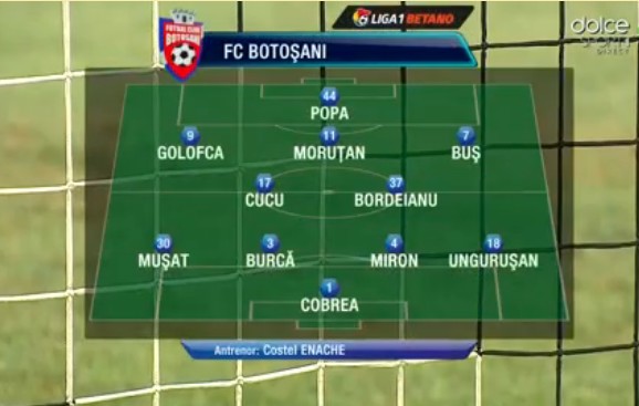 FC Botoșani: Cobrea (cpt) – Ungurușan, Miron, Burcă, Mușat – M. Bordeianu, Cucu – L. Buș, Moruțan, Golofca – D. Popa.