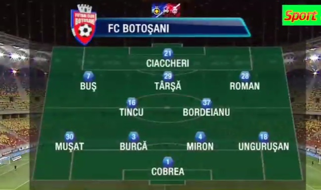 Botoșani: Cobrea – Ungurușan, A. Miron, A. Burcă, Mușat – Bordeianu, Târșa – M. Roman, Tincu, L. Buș – Ciaccheri