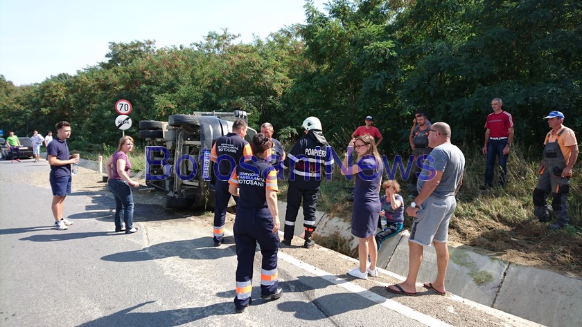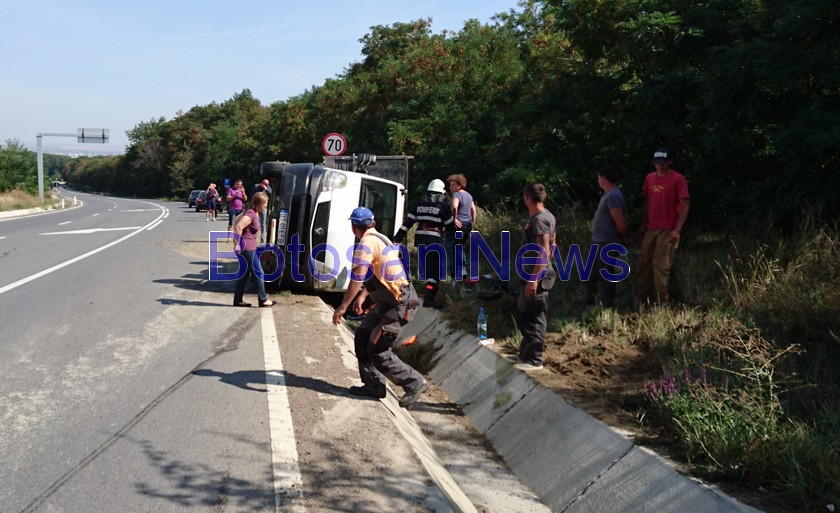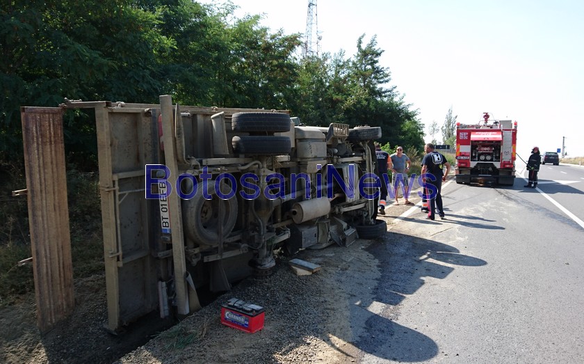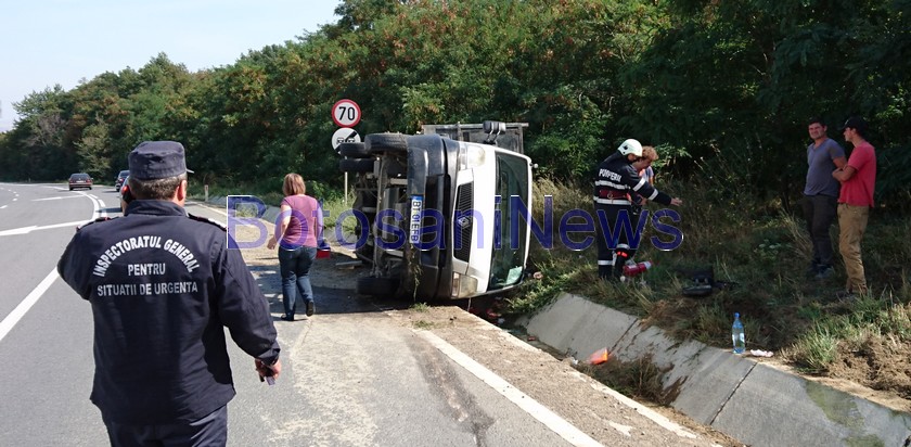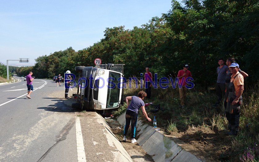 O mașină s-a răsturnat, sâmbătă după-amiază, pe drumul european Botoșani- Suceava, după ce a rămas fără o roată. Accidentul a avut loc la intrarea în localitatea Baisa, în momentul în care una din roțile din spate ale unei autoutilitare Renault a sărit.