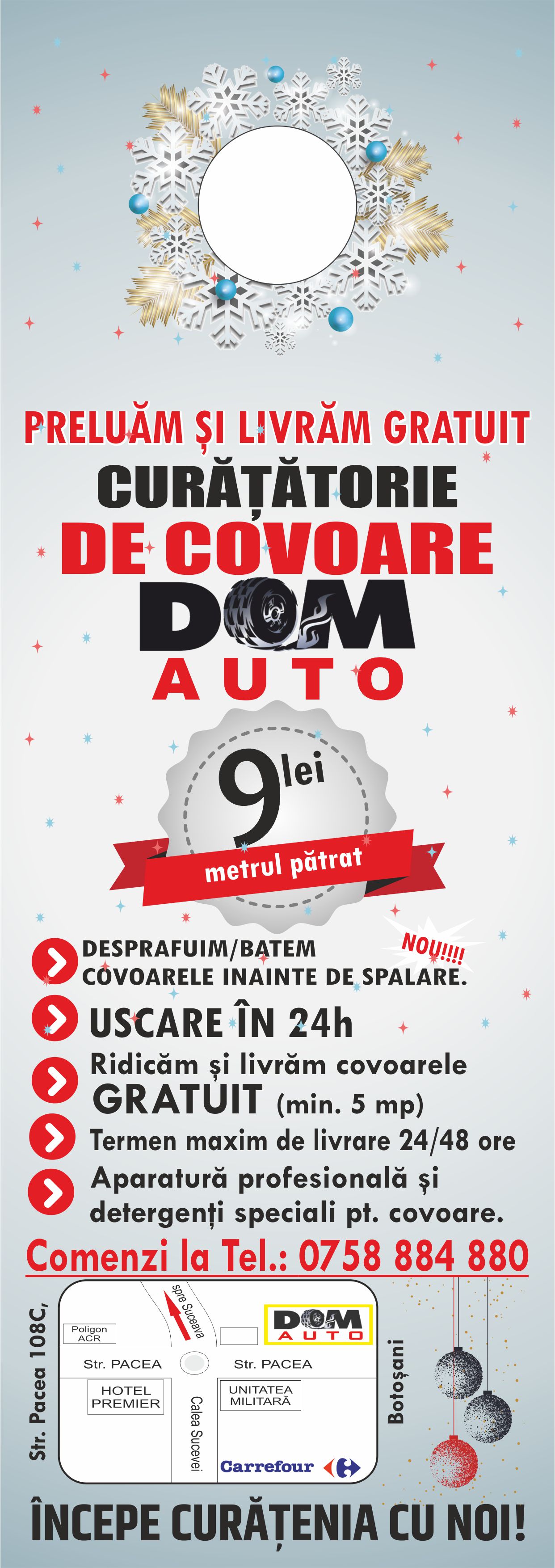 Curăţătoria profesională de covoare DOM Auto a lansat o ofertă specială pentru sărbătorile de iarnă. Ea a lansat un serviciu de preluare- livrare gratuită a covoarelor şi mochetelor de la şi către domiciliile clienţilor.