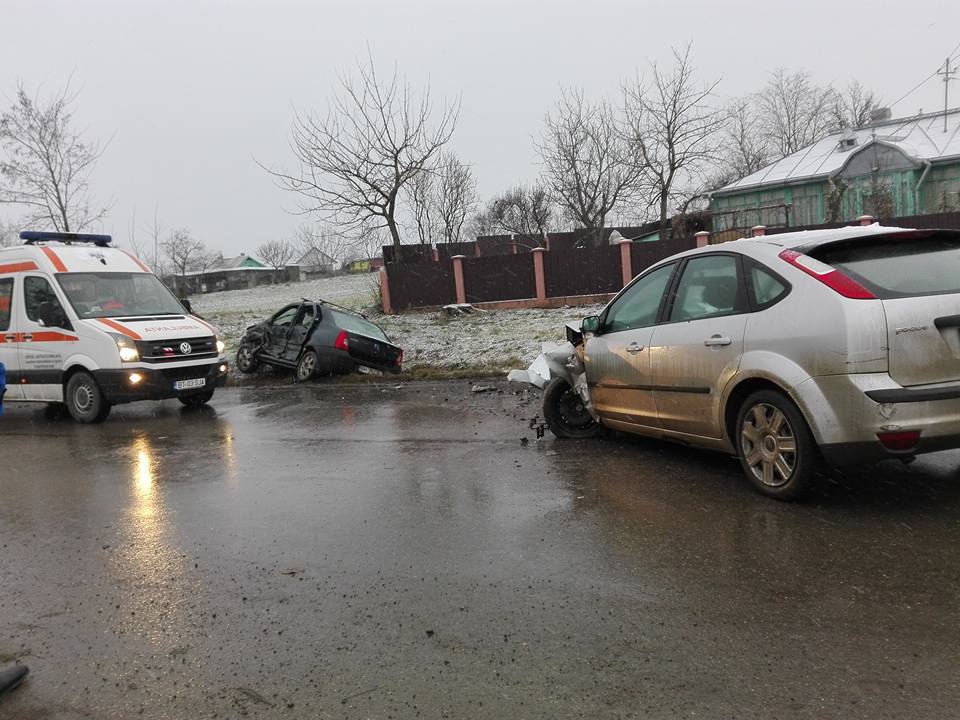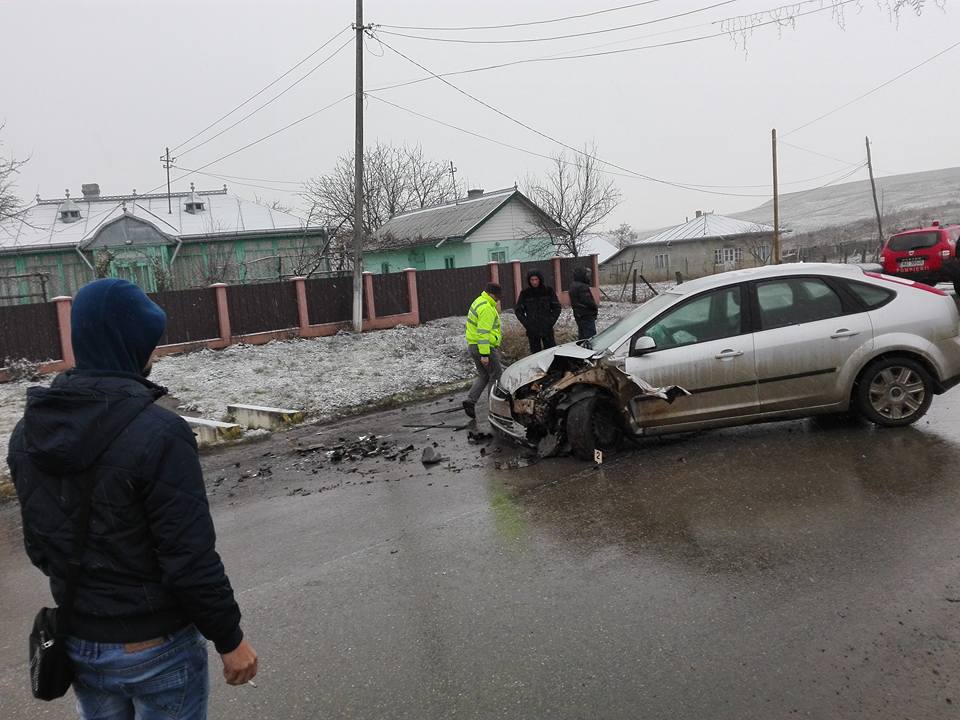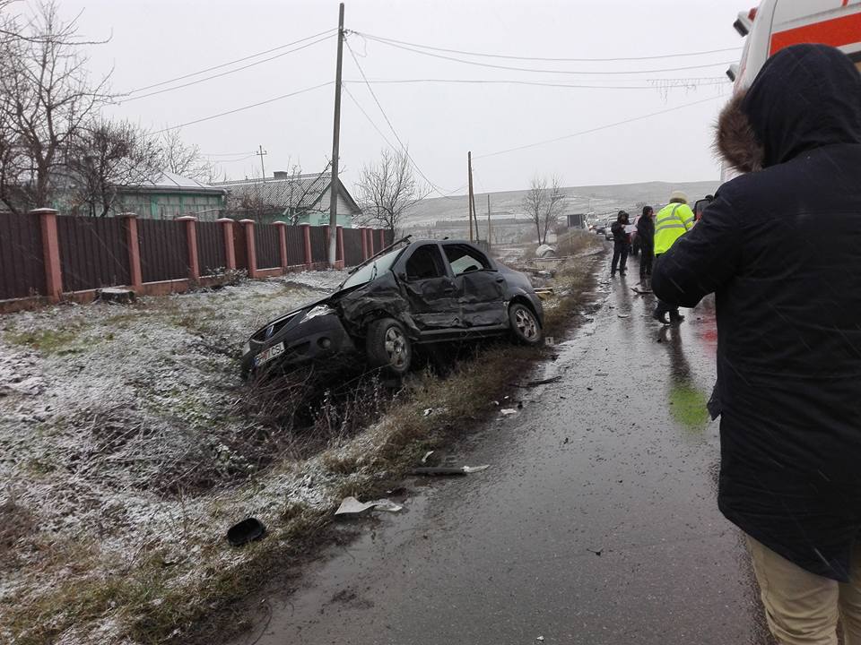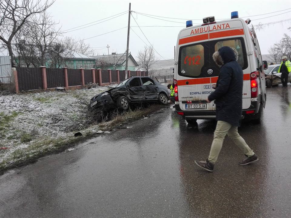 Accidentul a avut loc în curba la stânga de la ieșirea din Stăuceni, iar după impact şoferul, dar și alte trei persoane, aflate în Dacia Logan, au fost răniți, fiind transportaţi la spital.