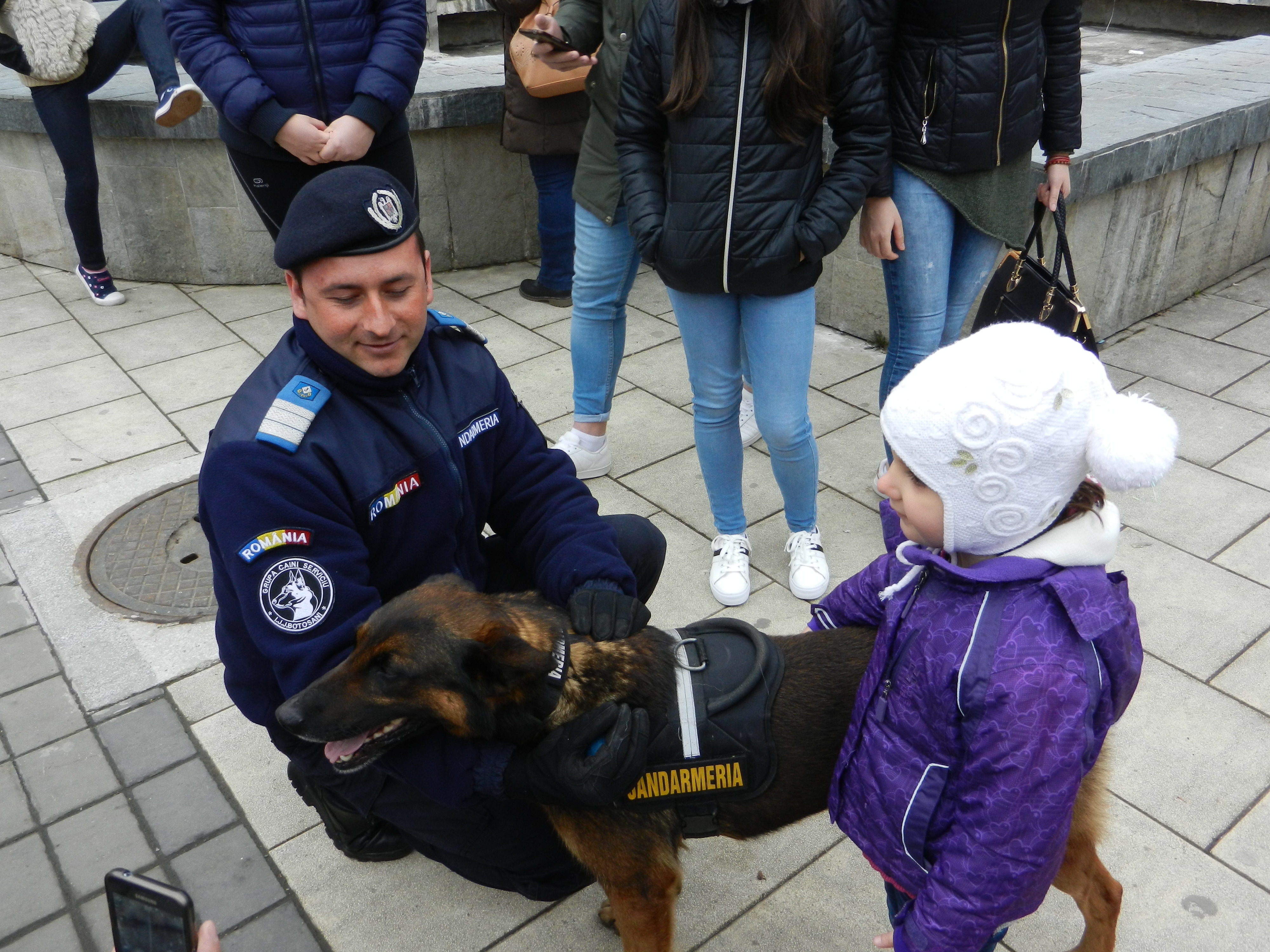 Câinii de serviciu au făcut deliciul copiilor, care au apreciat ,,giumbuşlucurile” exersate de câinele ,,Ţuţu” şi s-au fotografiat cu acesta.