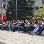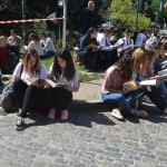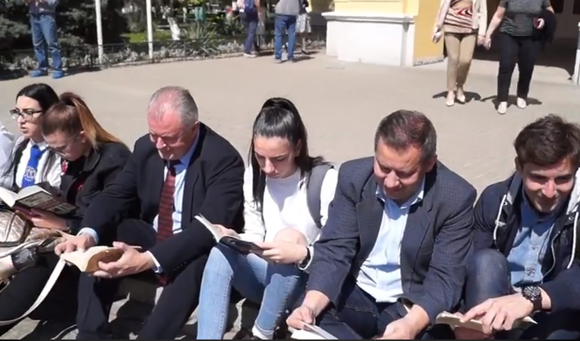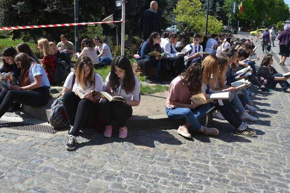 Primarul, consilierii și elevii s-au așezat pe bordurile din Piața Revoluției și au stat minute în șir cu cărțile în mână citind câteva rânduri.