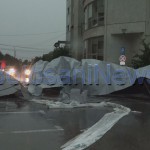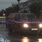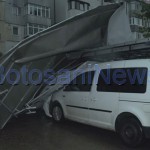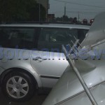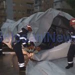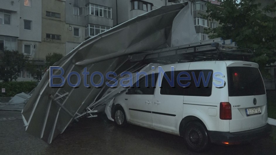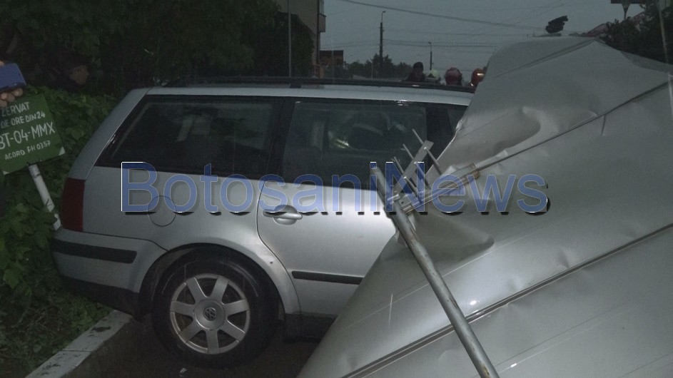 Trei mașini au fost avariate, joi seară, după ce șarpanta de la Casa Județeană de Pensii s-a desprins din cauza vântului puternic.
