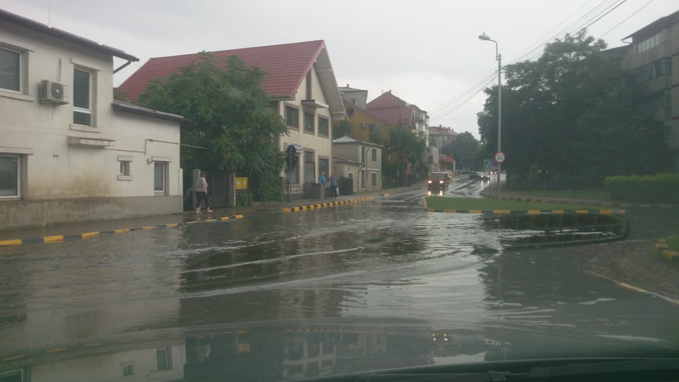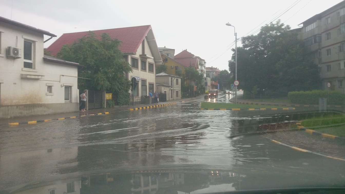 Mai multe intersecții importante sunt sub ape, iar un șofer a rămas cu mașina blocată printre șiroaie, la intersecția de pe Împărat Traian.