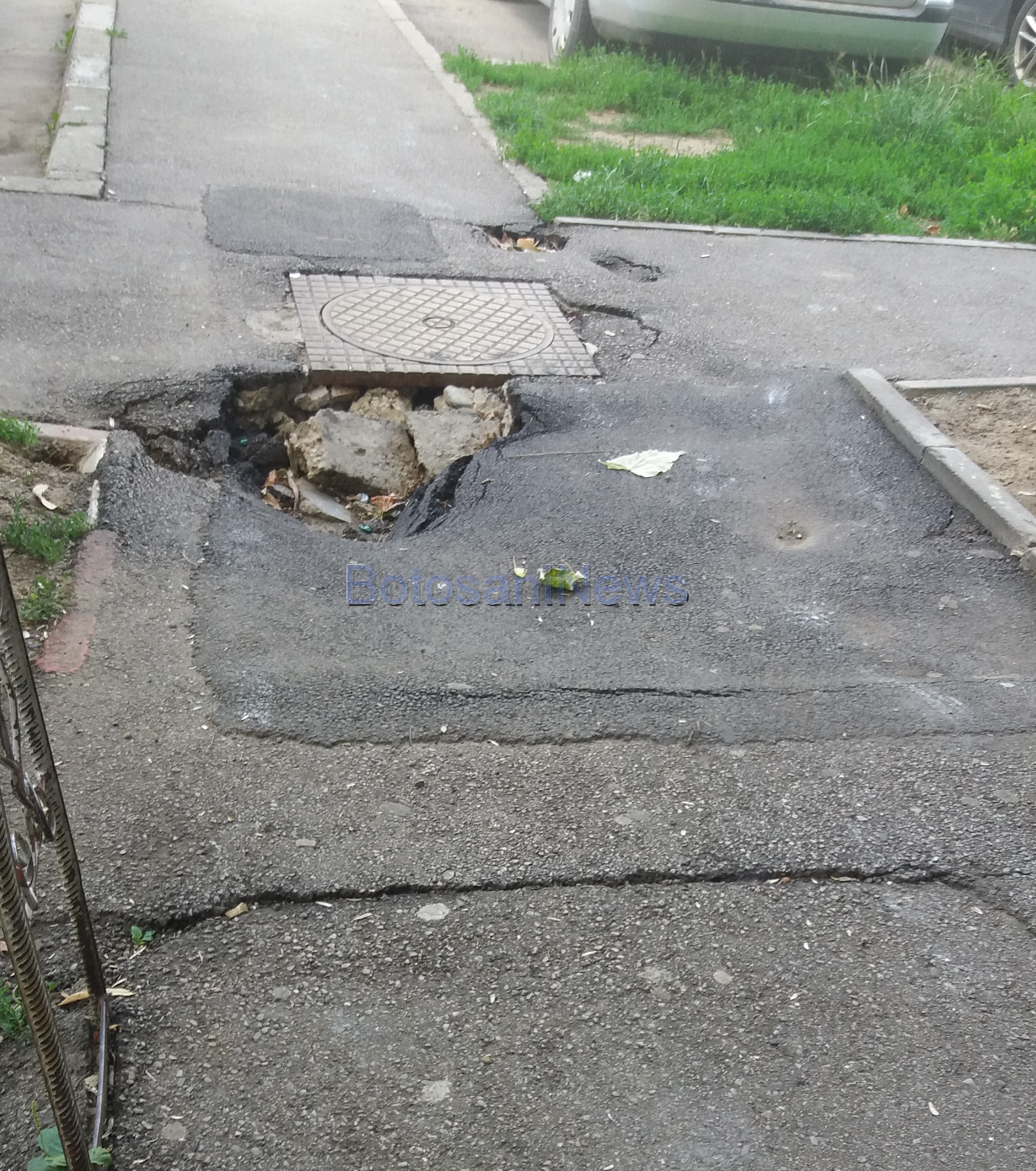 Este vorba despre Aleea Parcului, nr.10, sc C, unde în fața blocului s-au format trei gropi, în apropierea canalizării, una fiind de dimensiuni mai mari, iar locatarii au văzut cum ies șobolani din ea.