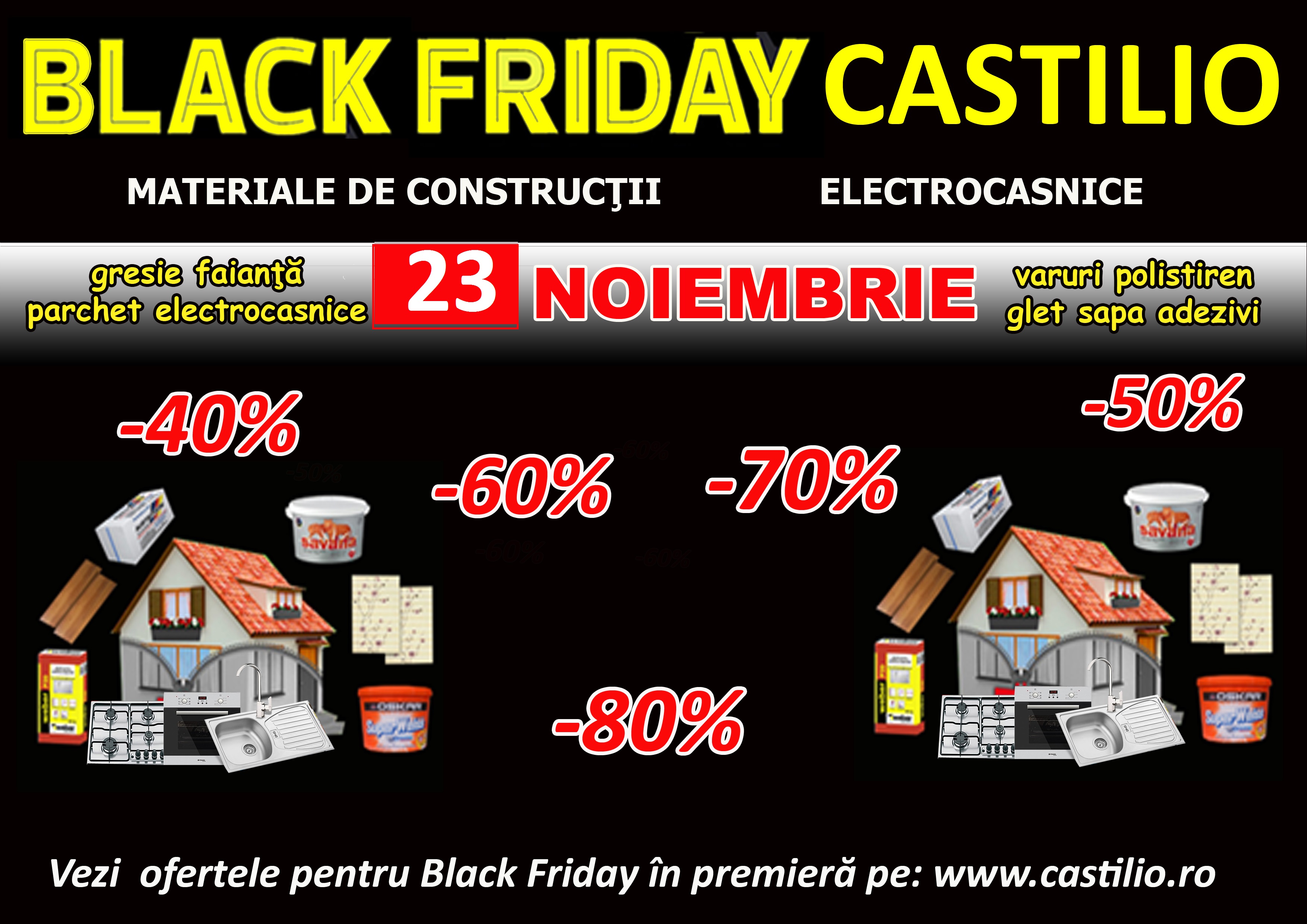 Castilio își așteaptă cumpărătorii la Black Friday, pe 23 noiembrie, începând cu ora 07:00, cu reduceri extraordinare la sute de produse, design 3D gresie şi faianţă pentru băi şi bucătării şi cumpărături în rate fără dobândă.