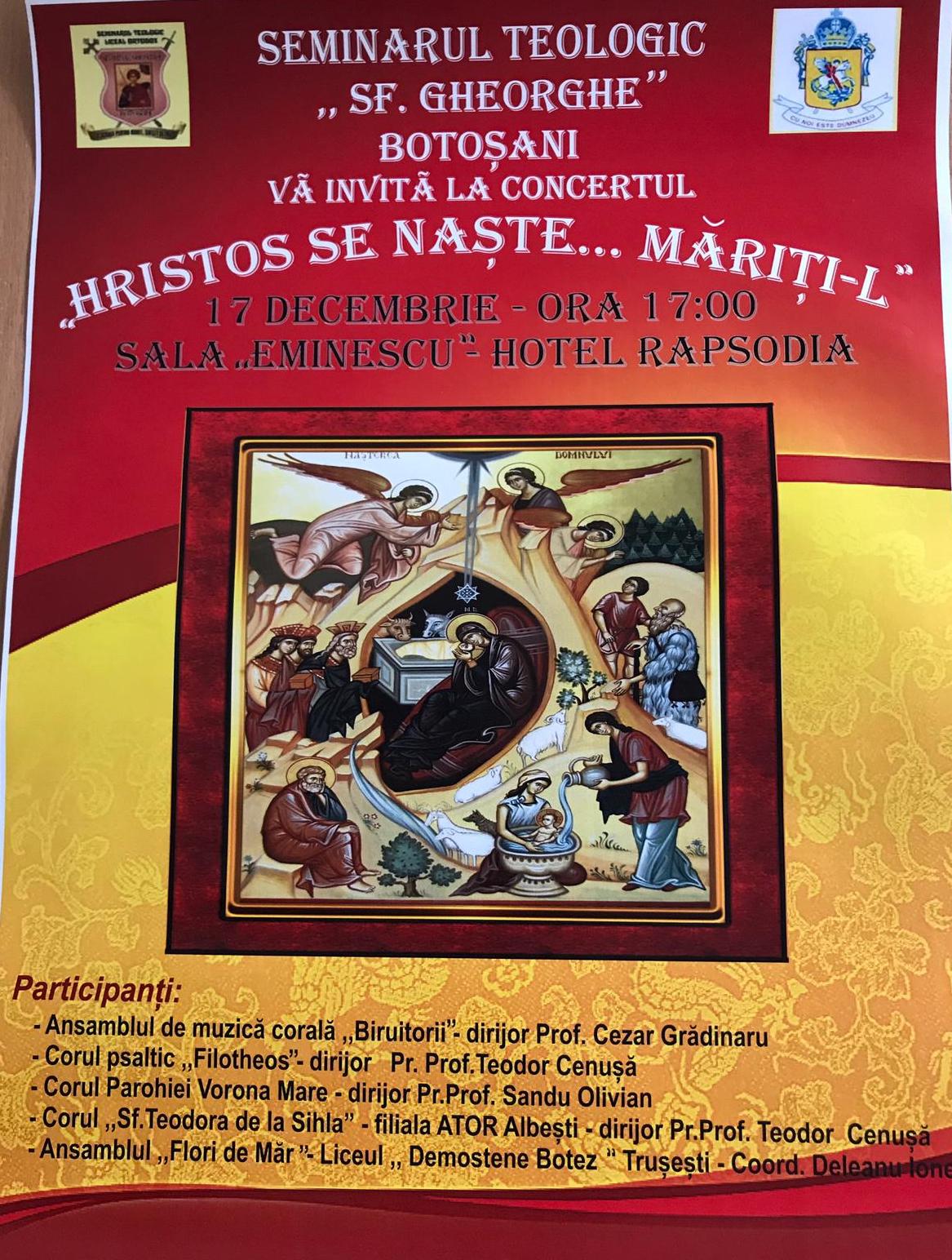 Elevii şi preoţii profesori de la Seminarul Teologic Ortodox Liceal „Sf. Gheorghe” din Botoşani aduc bucuria Crăciunului şi a Naşterii Domnului printr-un concert de colinde oferit, ca în fiecare an, botoşănenilor înainte de marea sărbătoare creştină.