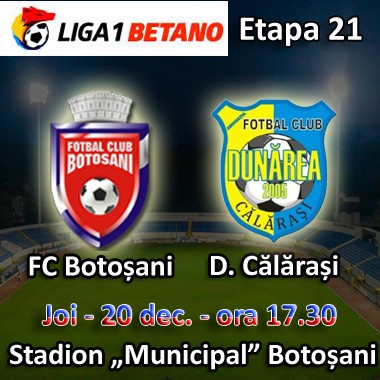 FC Botoșani întâlnește, joi, pe Dunărea Călărași în ultimul meci din acest an al Ligii 1. Partida se dispută pe Stadionul Municipal din Botoșani, începând cu ora 17.30.