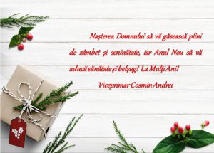 Mesajul de sărbători al viceprimarului municipiului Botoșani, Cosmin AndreiDistribuie:WhatsAppTweetTelegramReddit 31 decembrie 201831 decembrie 2018 Nasterea Domnului sa va gaseasca plini de zambet si seninatate, iar Anul Nou sa va aduca sanatate si belsug! La Multi Ani! Viceprimar Cosmin ANDREI Distribuie:WhatsAppTweetTelegramReddit