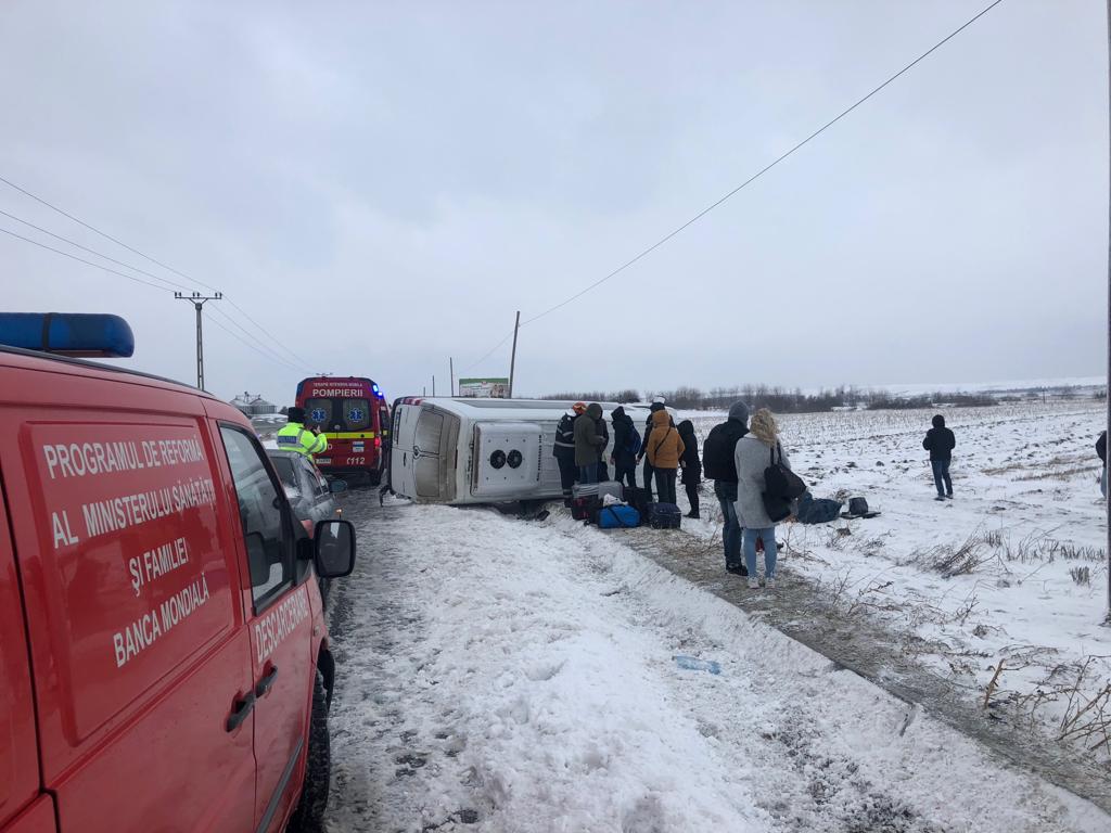 Un accident rutier a avut loc în prima zi de Crăciun, la ieșire din Botoșani, spre Dumbrăveni, pe DN 29. Un microbuz, în care se aflau 18 persoane, s-a răsturnat la intrarea în Dumbrăveni.