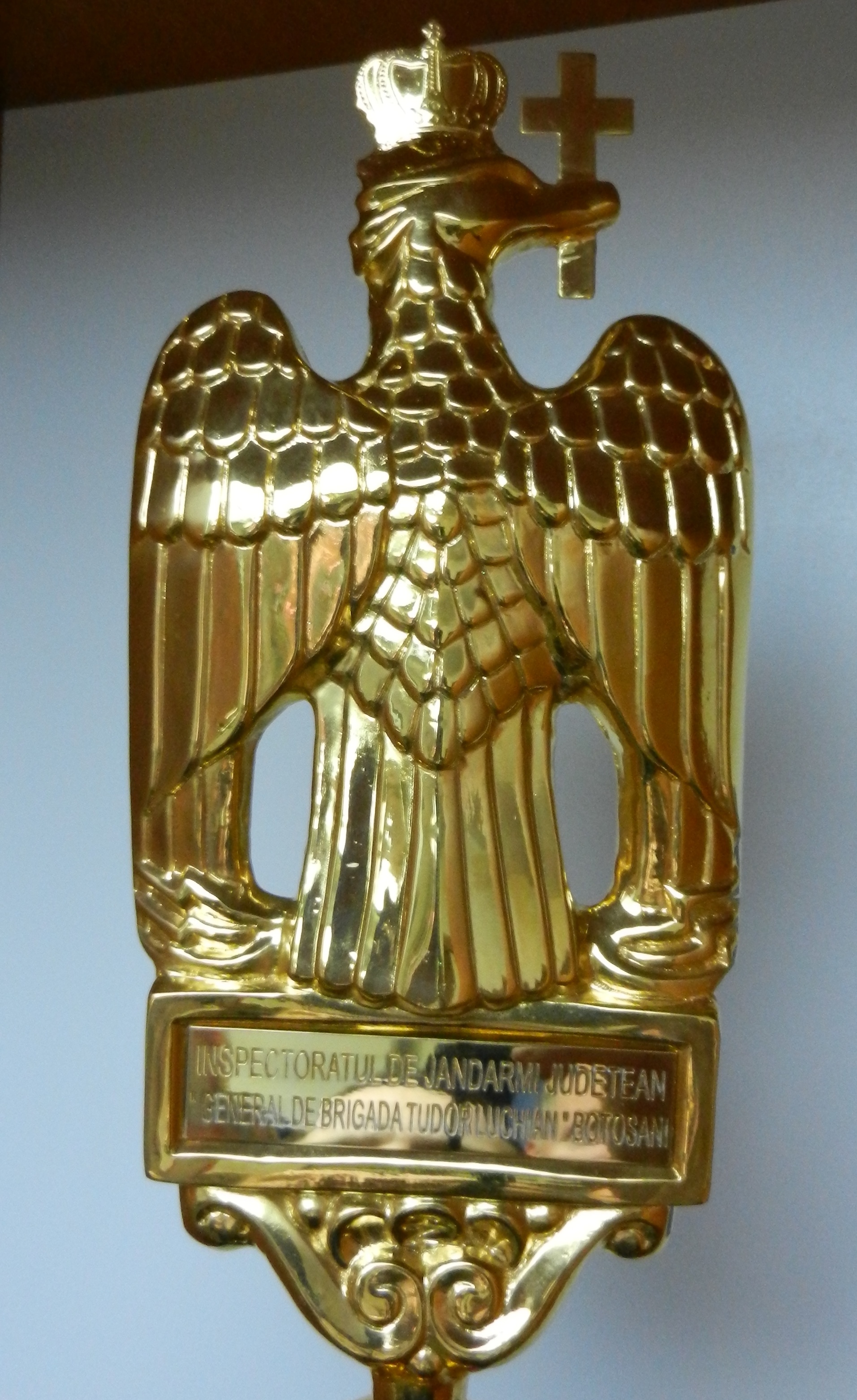 Inspectoratul de Jandarmi Judeţean Botoşani a înlocuit Drapelul de Luptă al Unităţii cu unul nou, actualizat conform legii promulgate de preşedintele României în anul 2016, care prevede readucerea coroanei pe capul acvilei de aur din stema ţării.