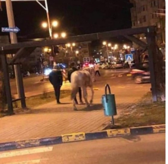 Un bărbat din Botoșani a fost surprins, marți seară, în timp ce își plimba calul prin fața Uvertura City Mall din Botoșani. Botoșăneanul mergea cu calul de căpăstru pe trotuarul din fața mall-ului, atrăgând privirile mirate ale trecătorilor.