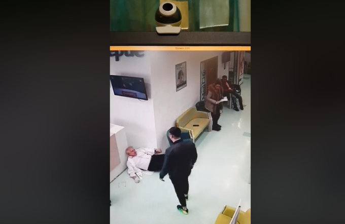 Doctorul cade şi se loveşte cu capul de un birou. În zonă apar mai multe asistente, iar apoi şi un medic care încearcă să-l liniştească pe agresor. Mediul nou sosit îi întinde mâna bărbatului nervos, însă acesta ignoră gestul, continuând să vocifereze.