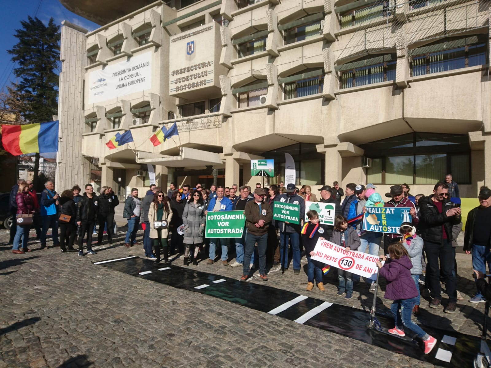 Zeci de persoane au participat, vineri, de la ora 15.00, la un protest pentru autostradă, în fața Prefecturii Botoșani.