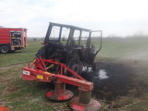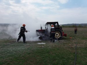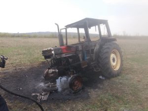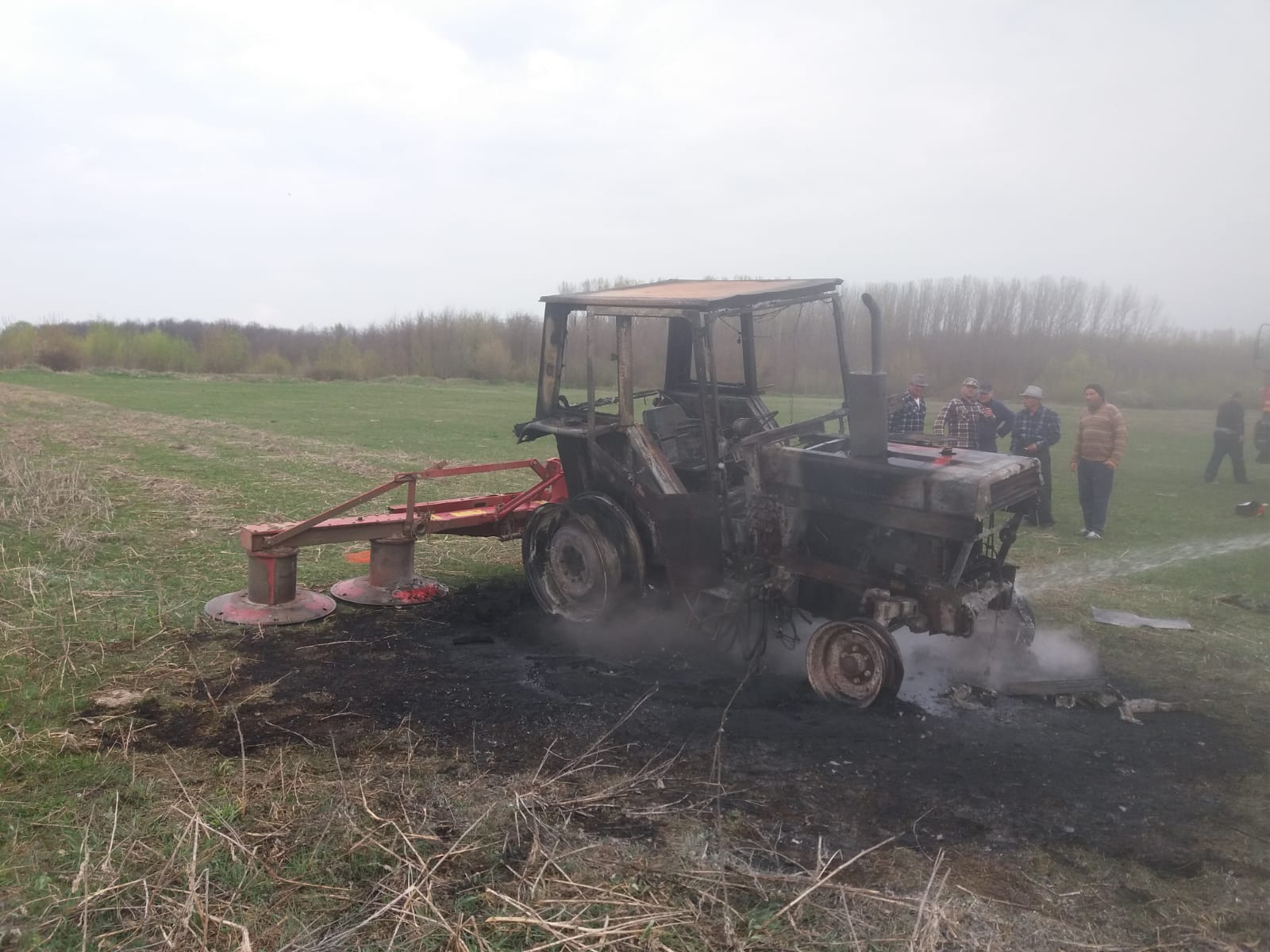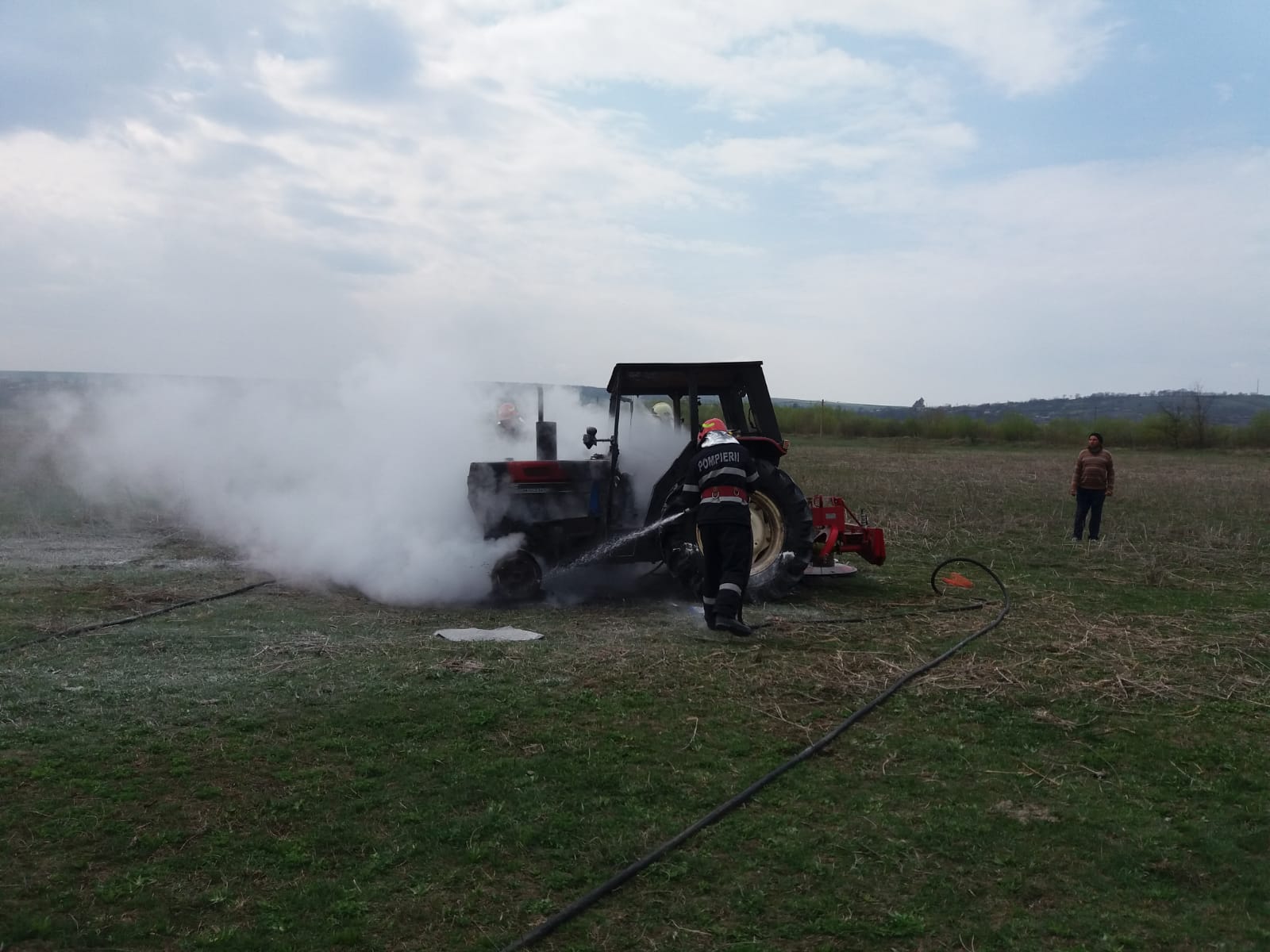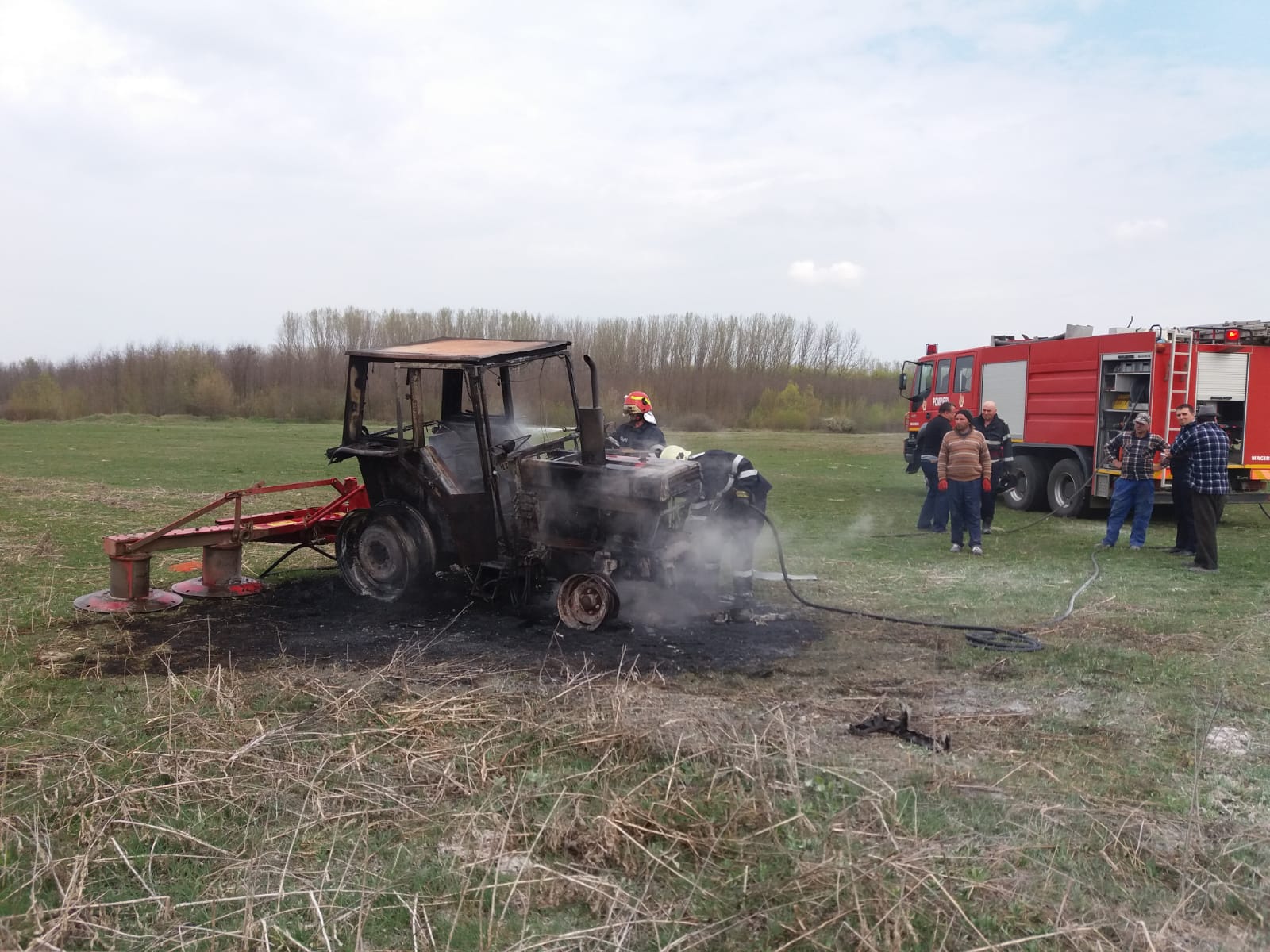 La sosirea fortelor de interventie, tractorul ardea. Cauza probabilă a incendiului este scurtcircuit electric.