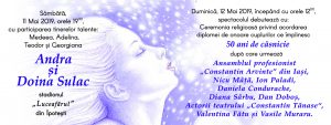 Duminica,incepand cu ora 12:00, artistii care vor incanta publicul sunt: Nicu Mata, Daniela Condurache, Ion Paladi, Diana Sarbu, Dan Dobos, Ansamblul profesionist „Constantin Arvinte” Iasi si actorii Valentina Fatu si Vasile Muraru.