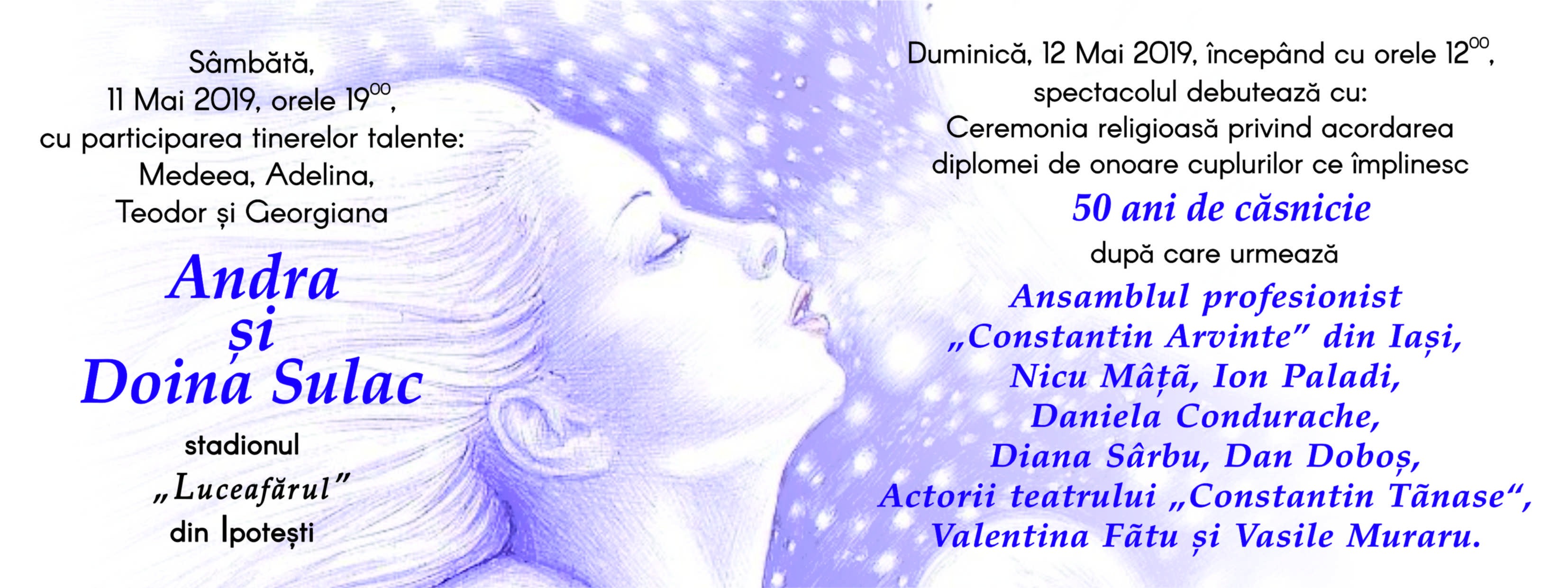 Sambata seara, incepand cu ora 19:00, vor concerta indragitele artiste DOINA SULAC si, placuta surpriza pentru spectatori, ANDRA.
