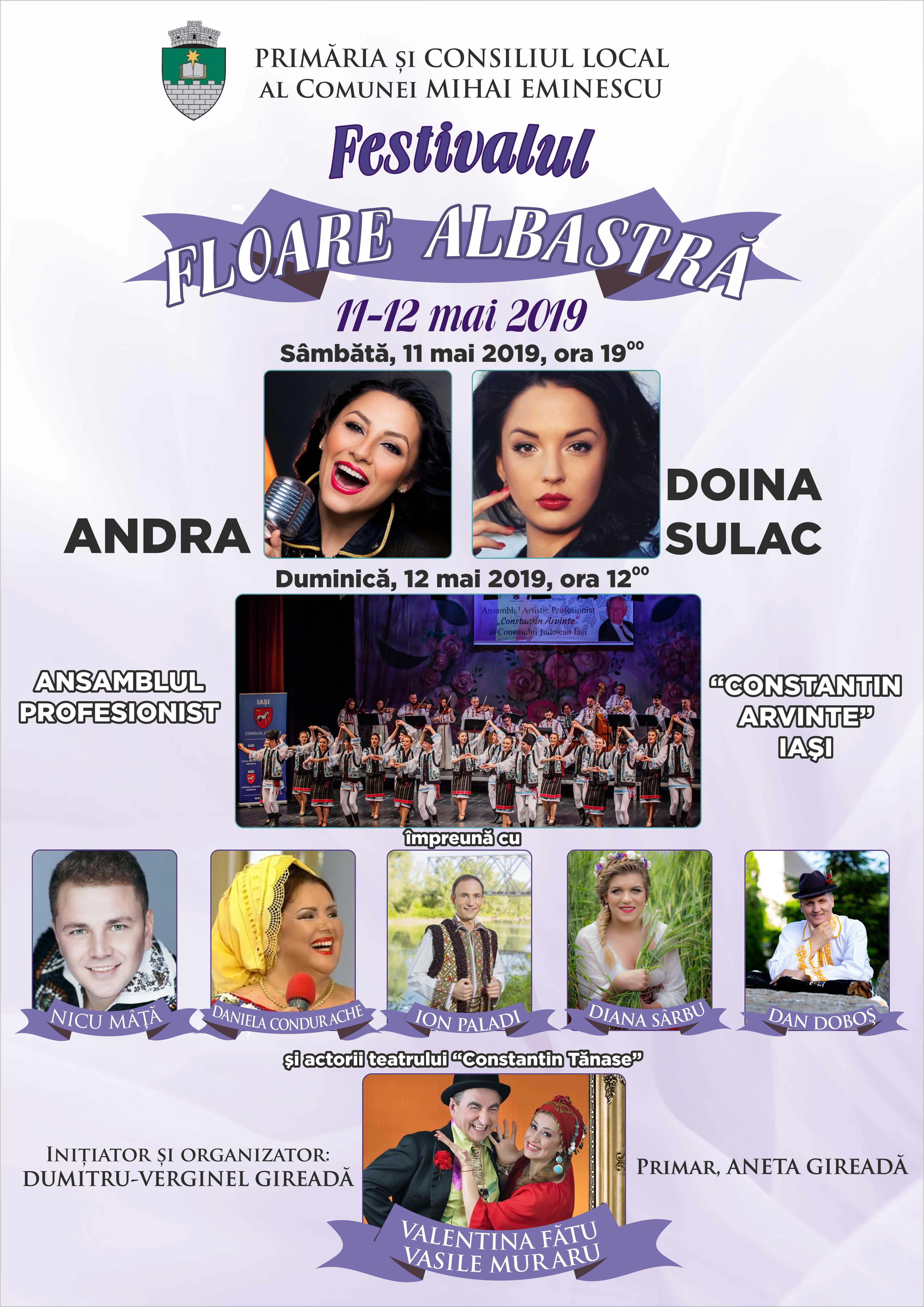 Ca in fiecare an, in luna mai, pe meleagurile eminesciene se organizeaza festivalul „Floare Albastra”. Initiatorul evenimentului, respectiv actualul reprezentant al institutiei, Gireada Dumitru Verginel, a tinut ca desfasurarea acestui eveniment sa devina o traditie, Festivalul din acest an fiind la cea de-a XII- a editie, acesta avand loc in perioada 11-12 mai pe stadionul „Luceafarul” din satul Ipotesti.