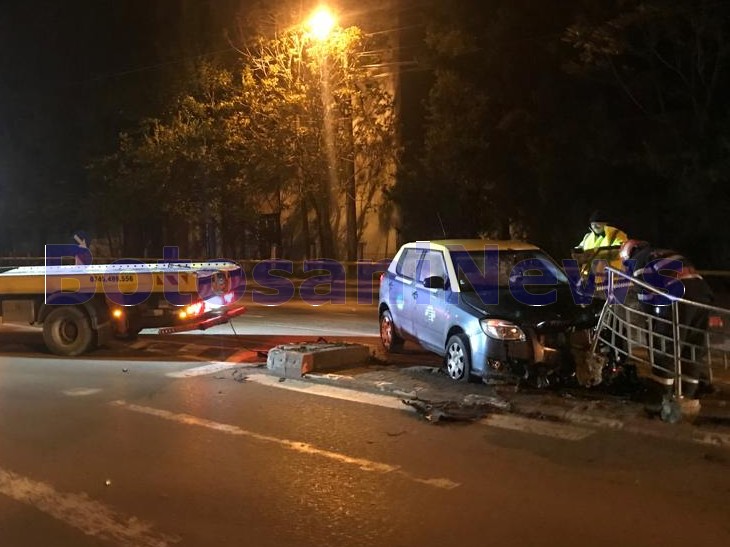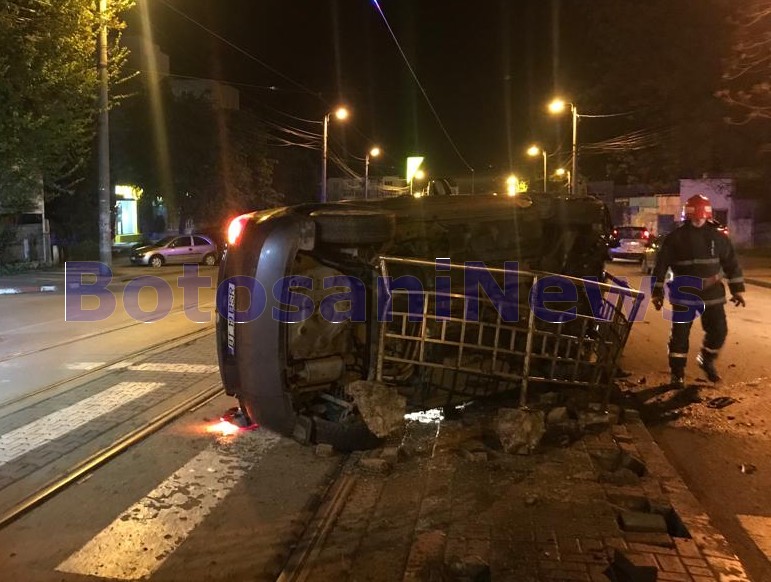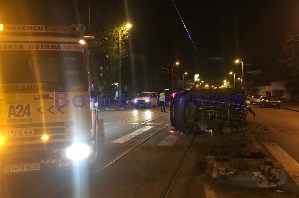 Un taxi s-a răsturnat la miezul nopții de miercuri spre joi pe o stradă din Botoșani, după ce a lovit un refugiu pentru tramvai. Accidentul a avut loc pe Calea Națională, în fața Liceului Textil din municipiul Botoșani, după ce șoferul pe fondul vitezei și a neatenției, a pierdut controlul asupra mașinii, a lovit scuarul și s-a răsturnat.