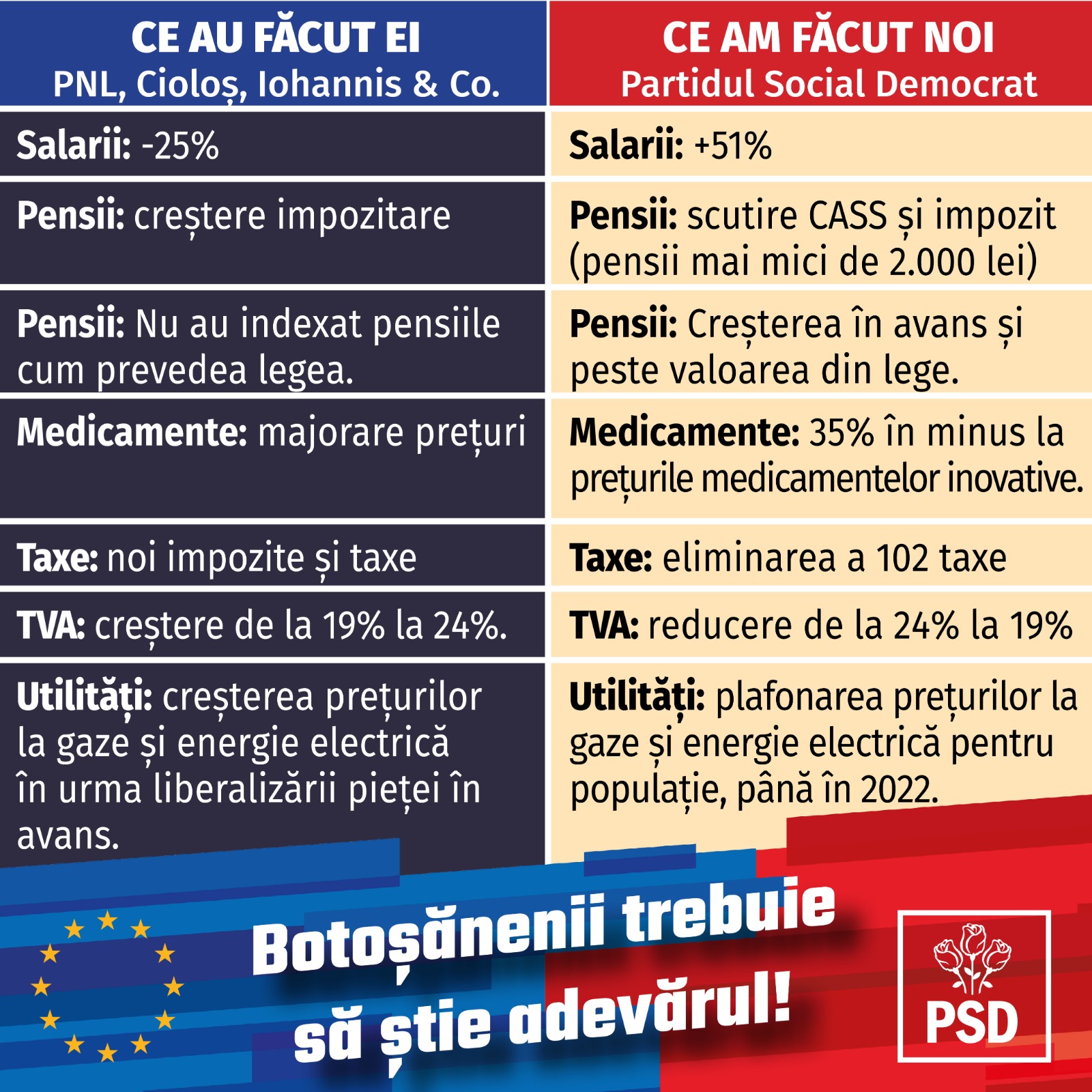 PSD este partidul care a realizat cele mai mari creșteri de venituri și reduceri de taxe în România din ultimii 30 de ani. După ce guvernarea PNL (PDL) a majorat TVA de la 19% la 24%, a crescut taxele firmelor, a impozitat pensiile, guvernarea PSD s-a remarcat întotdeauna prin îndreptarea inechităților, creșterea veniturilor, reducerea taxelor și stimularea economiei.