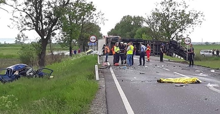 În urma impactului, TIR-ul s-a răsturnat, iar cele două autoturisme au fost aruncate în șantul de pe marginea drumului.