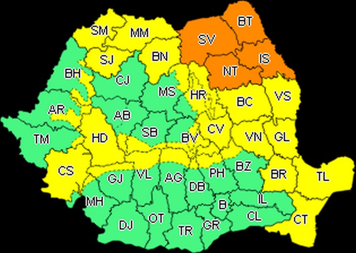 În județele Suceava, Botoșani, Neamț și Iași, va ploua torențial, iar în intervale scurte de timp sau prin acumulare se vor înregistra cantități de apă ce vor depăși local 40…50 l/mp și izolat 60…70 l/mp. Se vor semnala descărcări electrice, intensificări ale vântului și, posibil, grindină de medii și mari dimensiuni