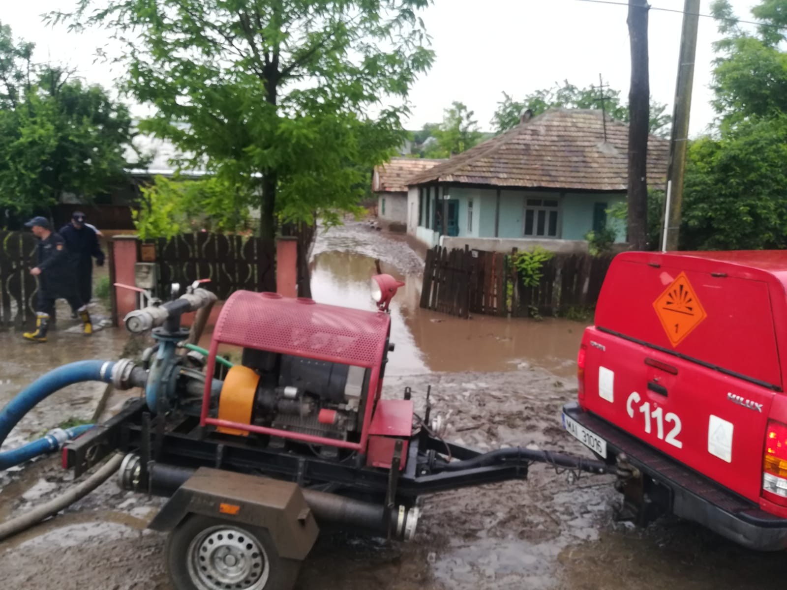Pompierii încă intervin la fața locului, pentru a scoate apa din casele oamenilor.