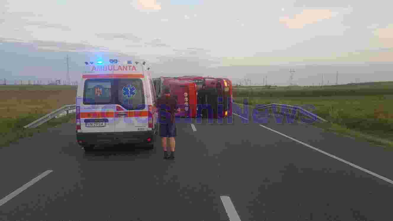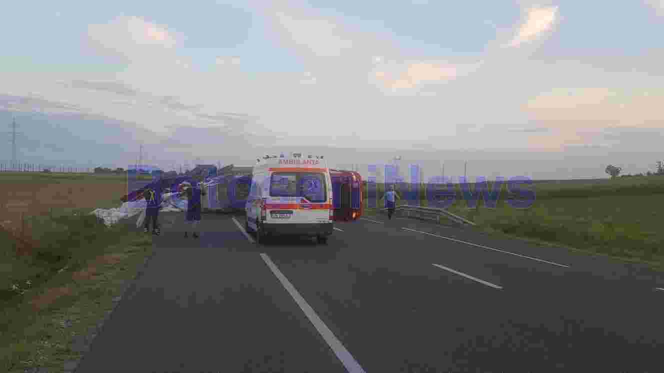 Din primele informații, șoferul tirului circula regulamentar, iar un autoturism din fața sa a frânat brusc, acesta a tras de volan, a prins acostamentul, a intrat în balans și s-a răsturnat.